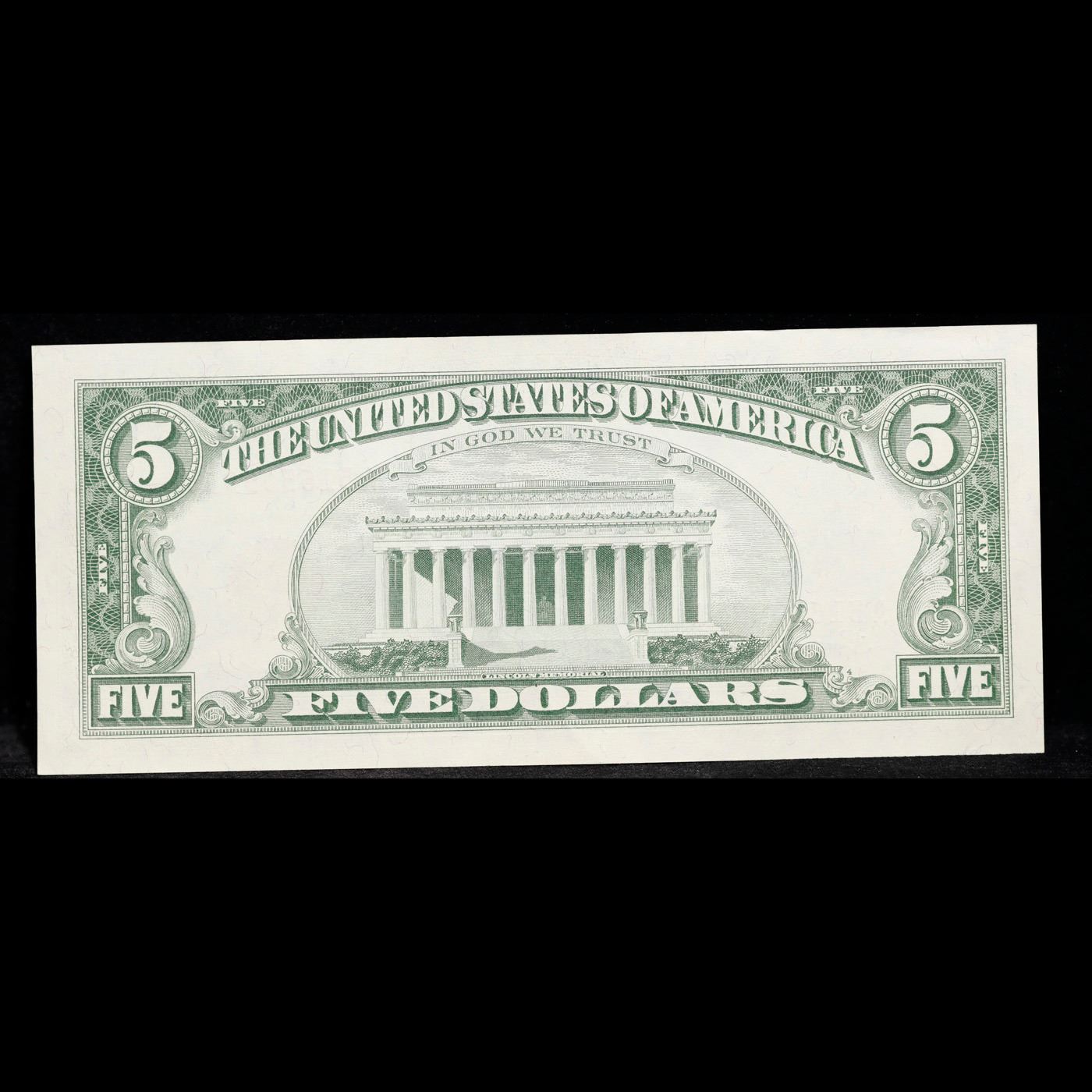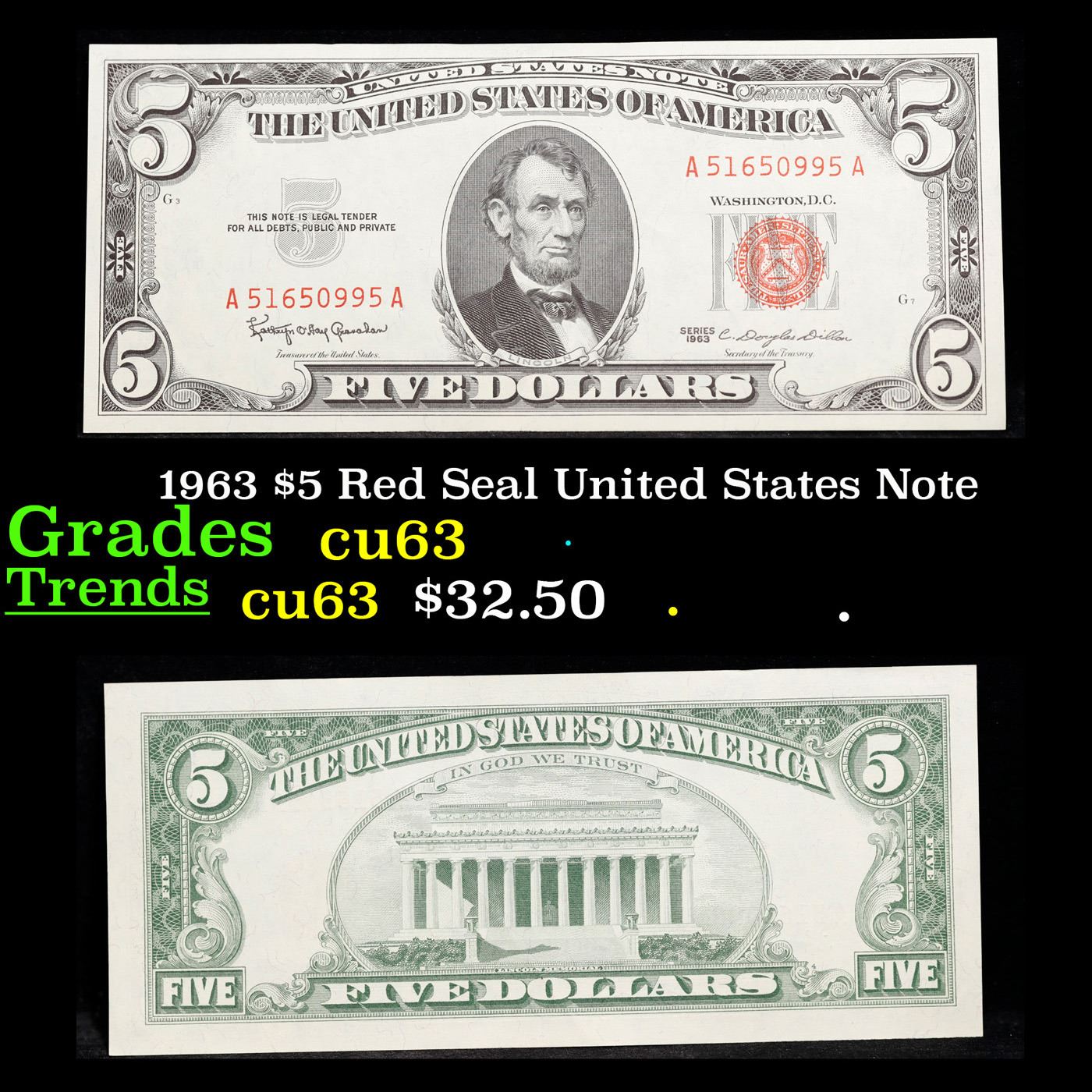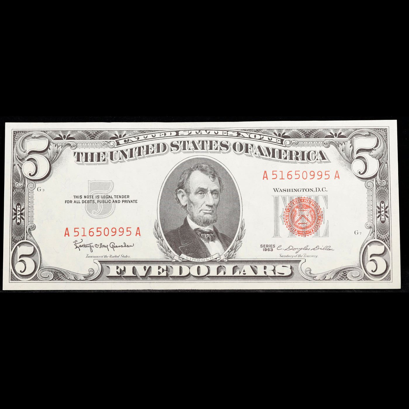 1963 $5 Red Seal United States Note Grades Select CU. Each 1963 five dollar red seal bill has serial number written in red ink. There is a red seal on the right hand side of the bill. All 1963 red seals were printed in Washington DC and feature a portrait of Abraham Lincoln in the center of the bill. You can also find the following wording on each bill, “United States Note, The United States of America, This Note Is A Legal Tender At Its Face Value For All Debts Public And Private, Will Pay To The Bearer On Demand Five Dollars”