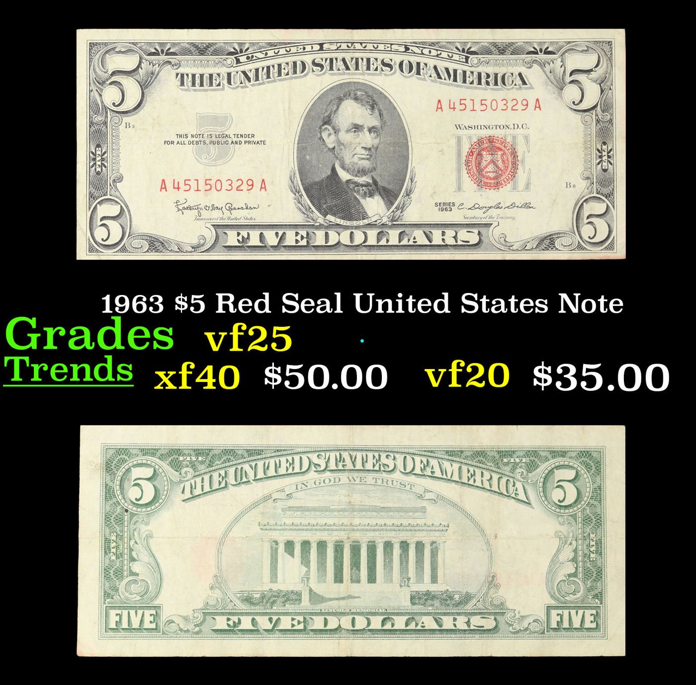 1963 $5 Red Seal United States Note Grades vf+. Each 1963 five dollar red seal bill has serial number written in red ink. There is a red seal on the right hand side of the bill. All 1963 red seals were printed in Washington DC and feature a portrait of Abraham Lincoln in the center of the bill. You can also find the following wording on each bill, “United States Note, The United States of America, This Note Is A Legal Tender At Its Face Value For All Debts Public And Private, Will Pay To The Bearer On Demand Five Dollars”