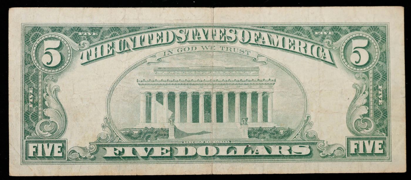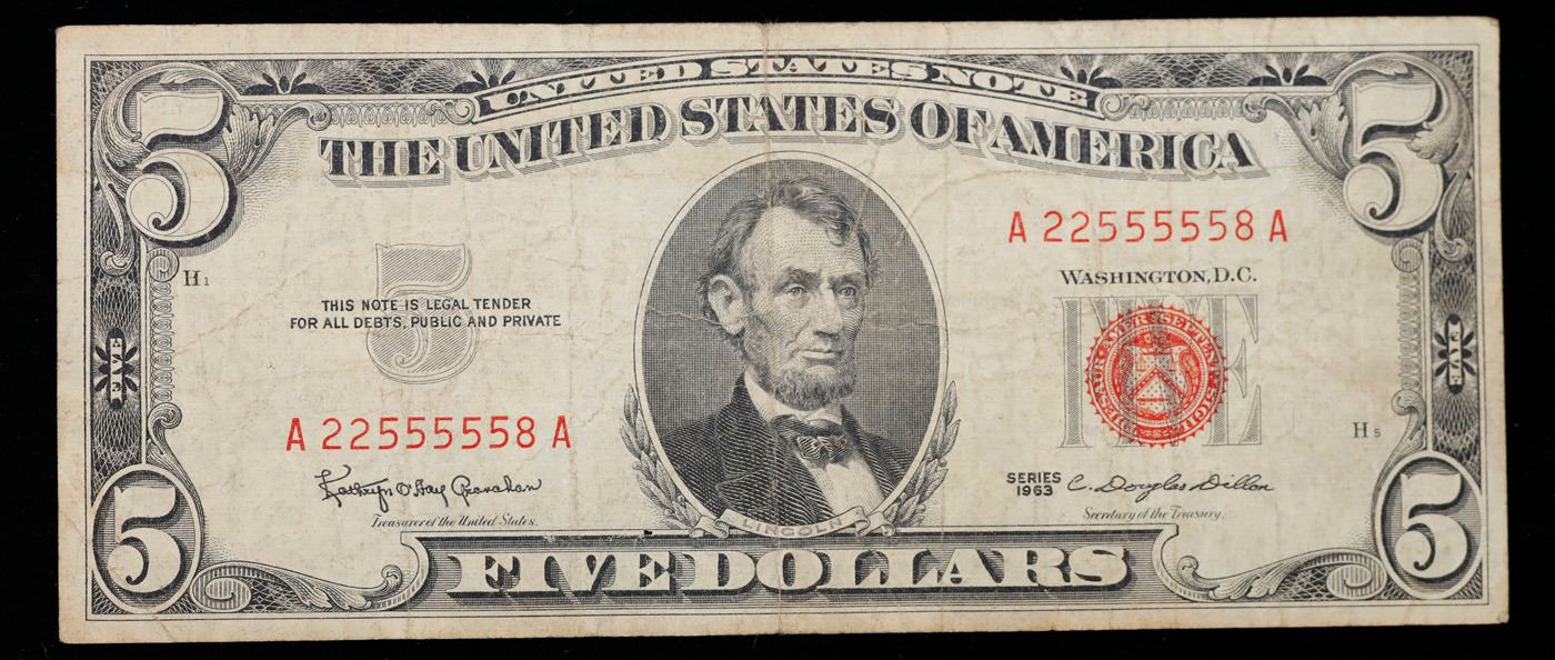 1963 $5 Red seal United States Note Fancy #22555558 Grades vf+. Each 1963 five dollar red seal bill has serial number written in red ink. There is a red seal on the right hand side of the bill. All 1963 red seals were printed in Washington DC and feature a portrait of Abraham Lincoln in the center of the bill. You can also find the following wording on each bill, “United States Note, The United States of America, This Note Is A Legal Tender At Its Face Value For All Debts Public And Private, Will Pay To The Bearer On Demand Five Dollars”