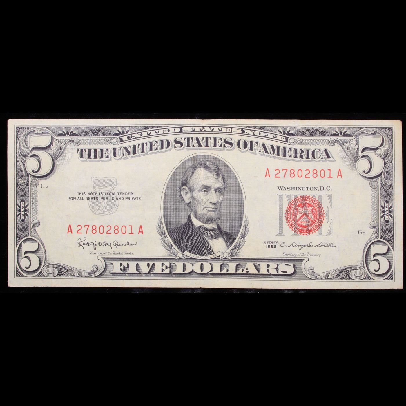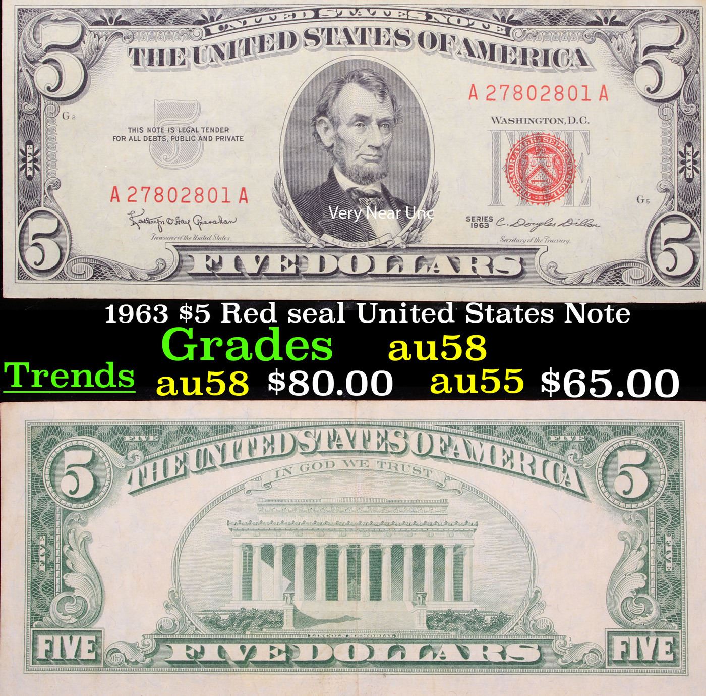 1963 $5 Red seal United States Note Grades Choice AU/BU Slider.