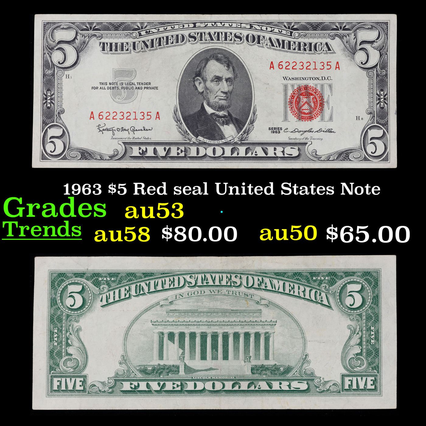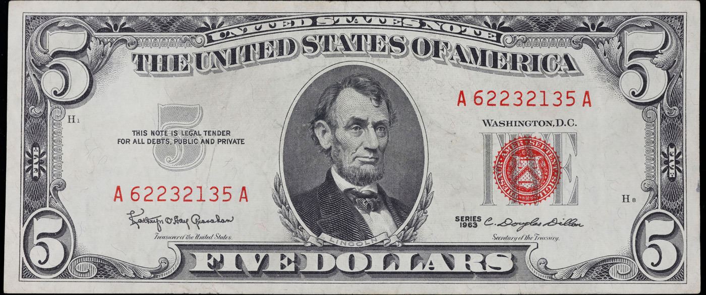 1963 $5 Red seal United States Note Grades Select AU.