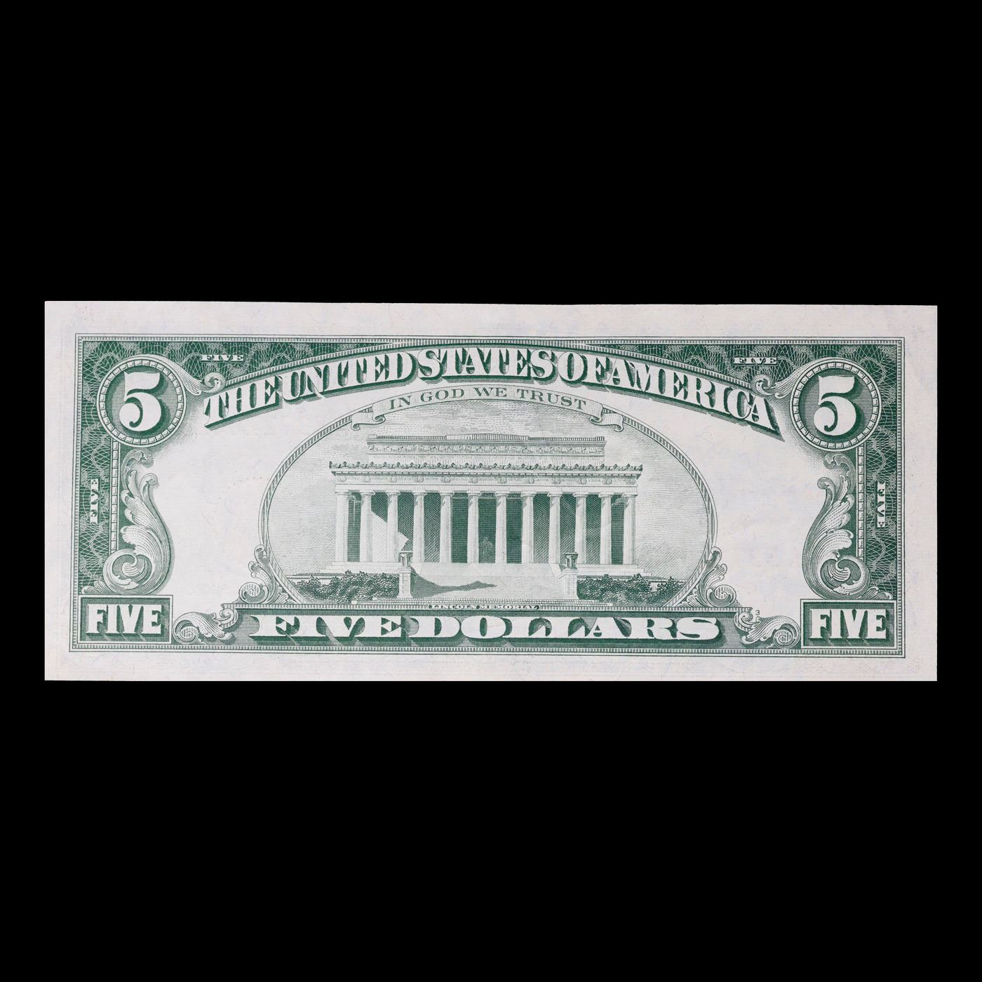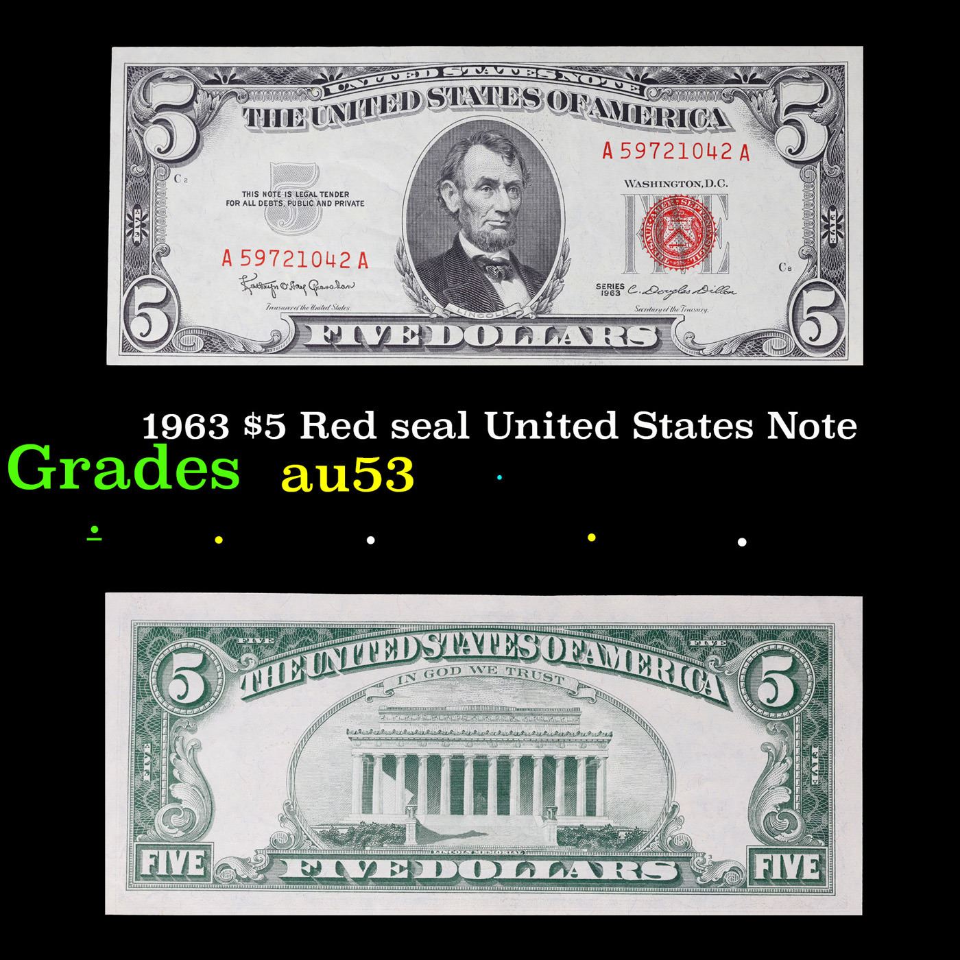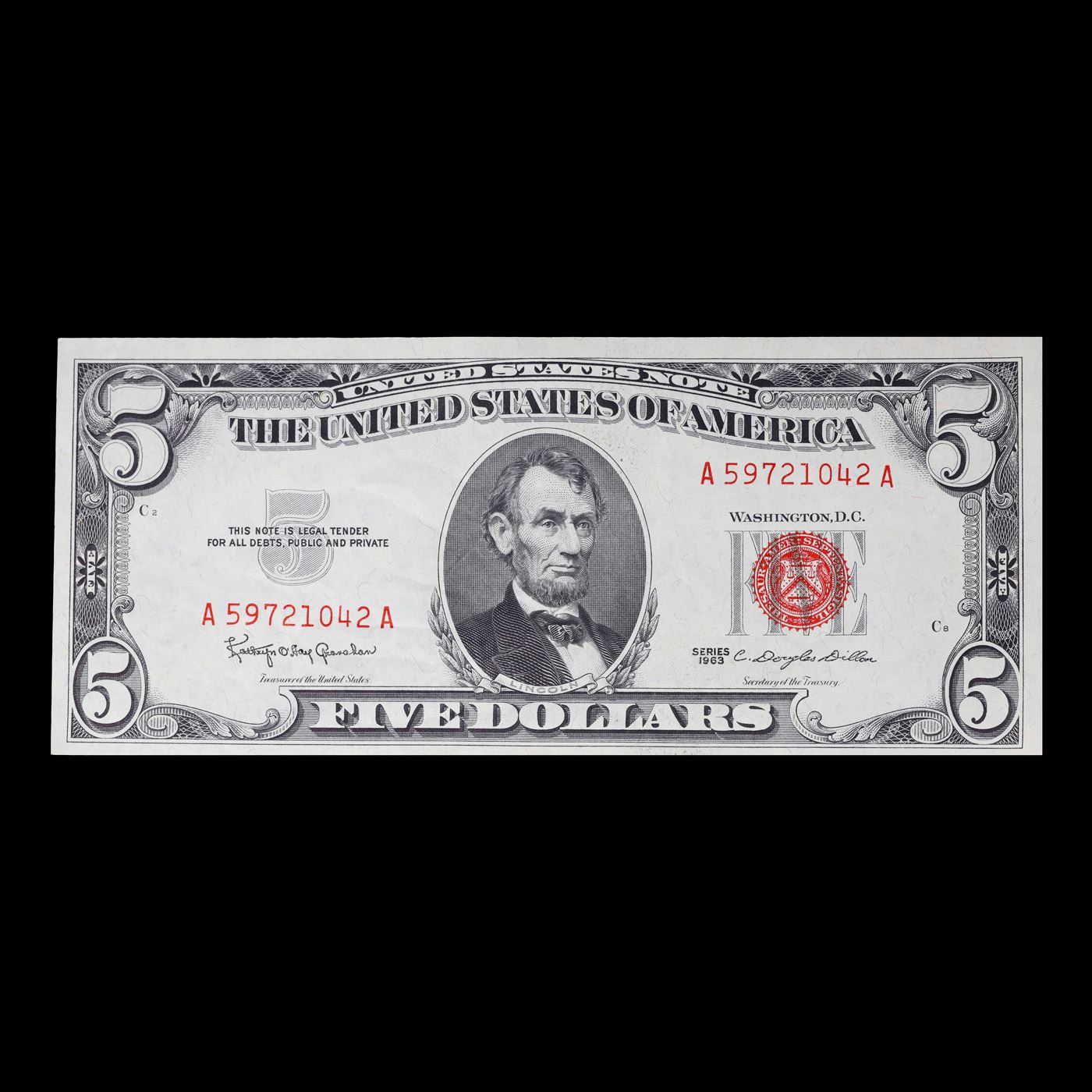 1963 $5 Red seal United States Note Grades Select AU. Each 1963 five dollar red seal bill has serial number written in red ink. There is a red seal on the right hand side of the bill. All 1963 red seals were printed in Washington DC and feature a portrait of Abraham Lincoln in the center of the bill. You can also find the following wording on each bill, “United States Note, The United States of America, This Note Is A Legal Tender At Its Face Value For All Debts Public And Private, Will Pay To The Bearer On Demand Five Dollars”