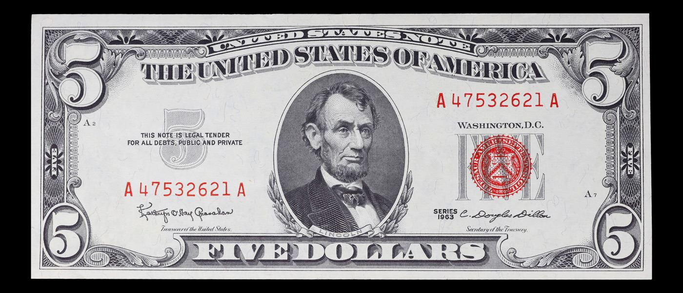 1963 $5 Red seal United States Note Grades Select CU. Each 1963 five dollar red seal bill has serial number written in red ink. There is a red seal on the right hand side of the bill. All 1963 red seals were printed in Washington DC and feature a portrait of Abraham Lincoln in the center of the bill. You can also find the following wording on each bill, “United States Note, The United States of America, This Note Is A Legal Tender At Its Face Value For All Debts Public And Private, Will Pay To The Bearer On Demand Five Dollars”