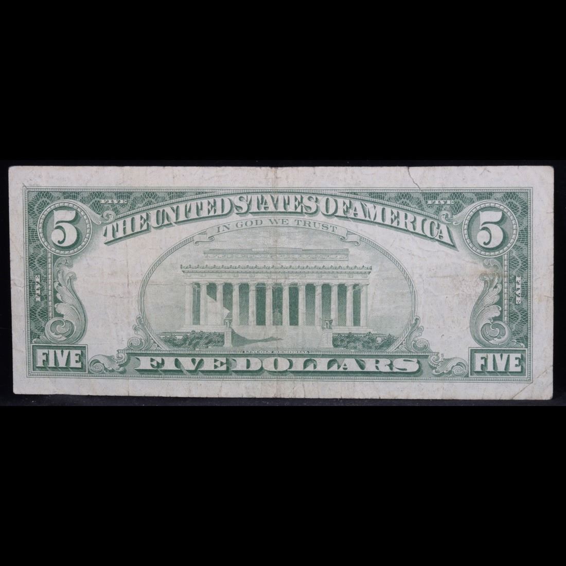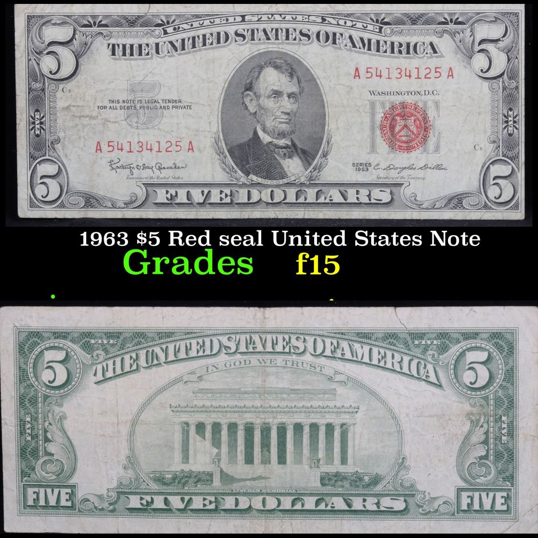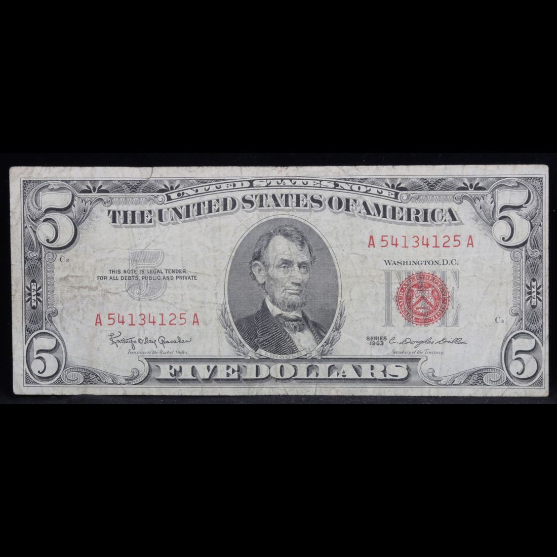 1963 $5 Red seal United States Note . . Grades f+. Each 1963 five dollar red seal bill has serial number written in red ink. There is a red seal on the right hand side of the bill. All 1963 red seals were printed in Washington DC and feature a portrait of Abraham Lincoln in the center of the bill. You can also find the following wording on each bill, ÒUnited States Note, The United States of America, This Note Is A Legal Tender At Its Face Value For All Debts Public And Private, Will Pay To The Bearer On Demand Five DollarsÓ