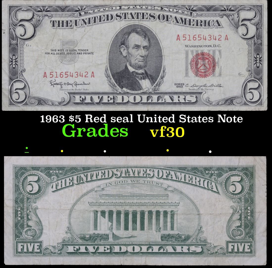 1963 $5 Red seal United States Note Grades vf++. Each 1963 five dollar red seal bill has serial number written in red ink. There is a red seal on the right hand side of the bill. All 1963 red seals were printed in Washington DC and feature a portrait of Abraham Lincoln in the center of the bill. You can also find the following wording on each bill, ÒUnited States Note, The United States of America, This Note Is A Legal Tender At Its Face Value For All Debts Public And Private, Will Pay To The Bearer On Demand Five DollarsÓ