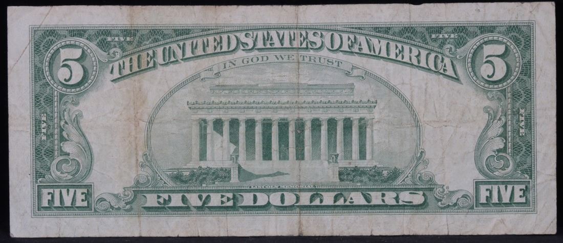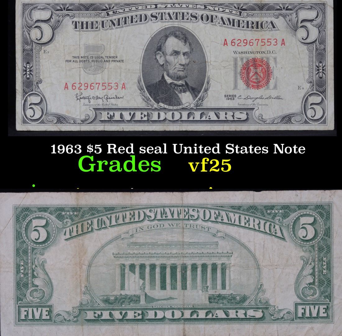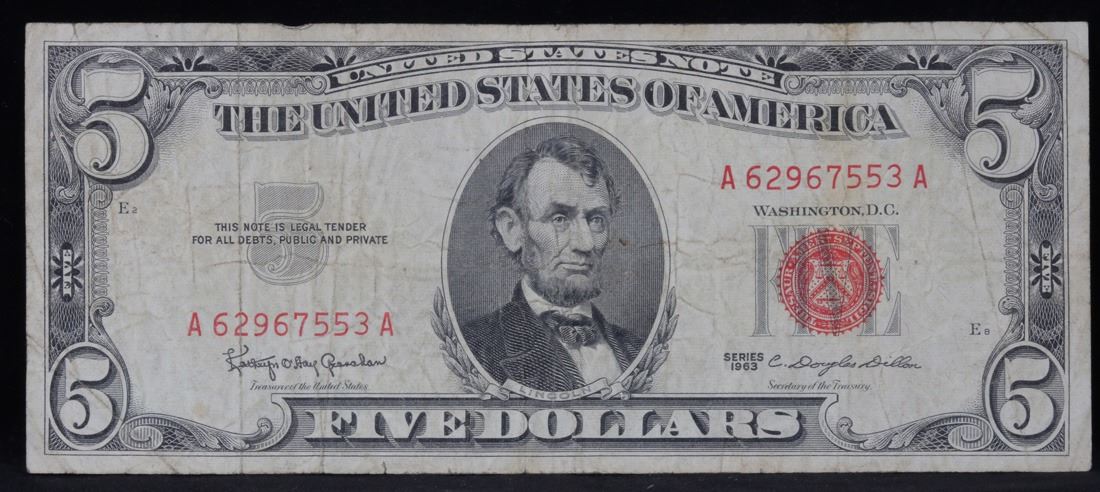 1963 $5 Red seal United States Note . . Grades vf+. Each 1963 five dollar red seal bill has serial number written in red ink. There is a red seal on the right hand side of the bill. All 1963 red seals were printed in Washington DC and feature a portrait of Abraham Lincoln in the center of the bill. You can also find the following wording on each bill, ÒUnited States Note, The United States of America, This Note Is A Legal Tender At Its Face Value For All Debts Public And Private, Will Pay To The Bearer On Demand Five DollarsÓ