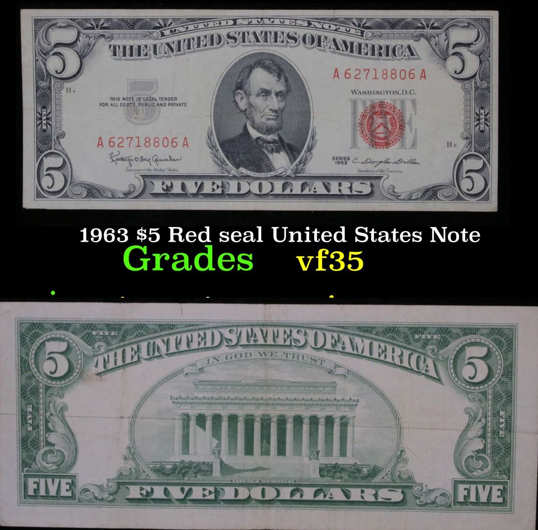 1963 $5 Red seal United States Note . . Grades vf++. Each 1963 five dollar red seal bill has serial number written in red ink. There is a red seal on the right hand side of the bill. All 1963 red seals were printed in Washington DC and feature a portrait of Abraham Lincoln in the center of the bill. You can also find the following wording on each bill, ÒUnited States Note, The United States of America, This Note Is A Legal Tender At Its Face Value For All Debts Public And Private, Will Pay To The Bearer On Demand Five DollarsÓ