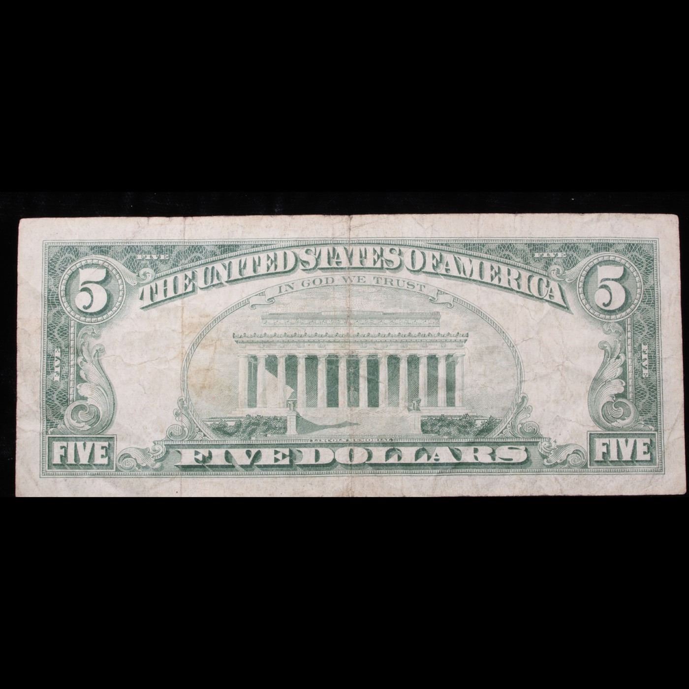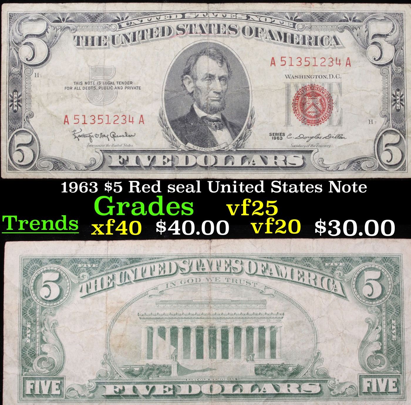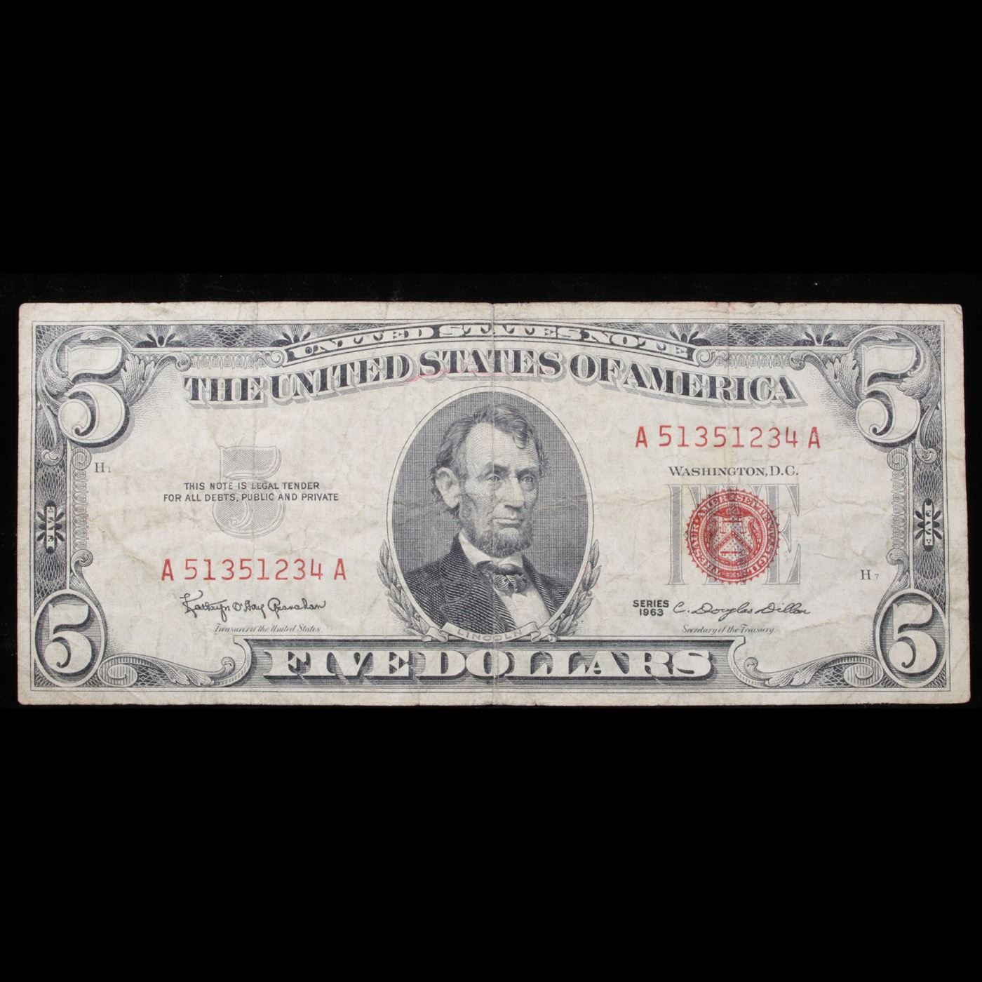 1963 $5 Red seal United States Note Grades vf+. Each 1963 five dollar red seal bill has serial number written in red ink. There is a red seal on the right hand side of the bill. All 1963 red seals were printed in Washington DC and feature a portrait of Abraham Lincoln in the center of the bill. You can also find the following wording on each bill, “United States Note, The United States of America, This Note Is A Legal Tender At Its Face Value For All Debts Public And Private, Will Pay To The Bearer On Demand Five Dollars”