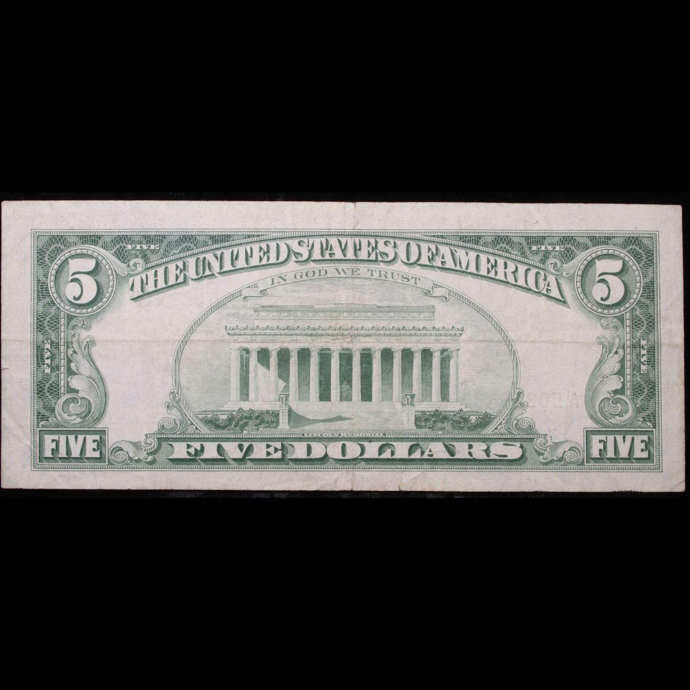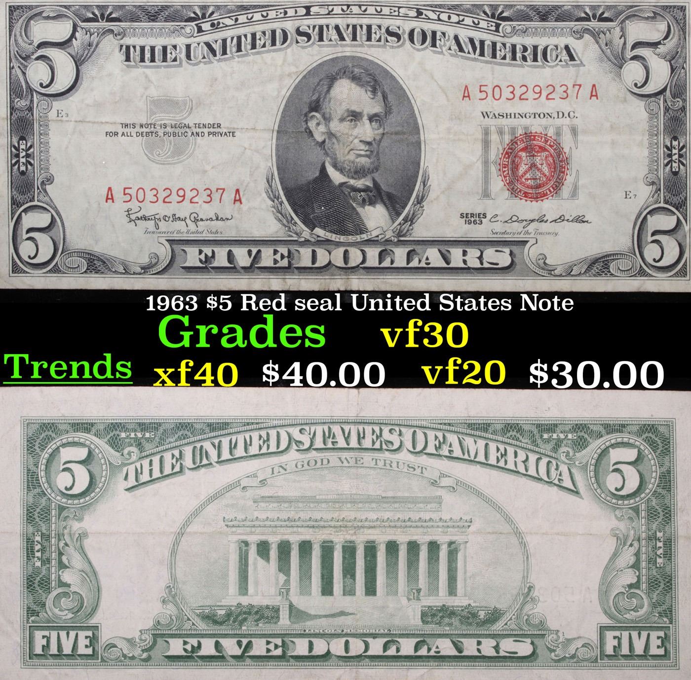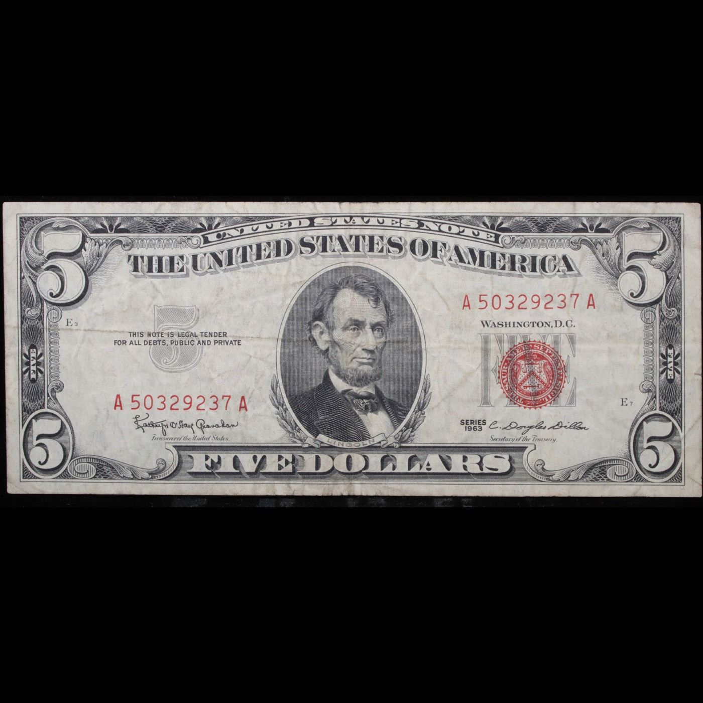 1963 $5 Red seal United States Note Grades vf++. Each 1963 five dollar red seal bill has serial number written in red ink. There is a red seal on the right hand side of the bill. All 1963 red seals were printed in Washington DC and feature a portrait of Abraham Lincoln in the center of the bill. You can also find the following wording on each bill, “United States Note, The United States of America, This Note Is A Legal Tender At Its Face Value For All Debts Public And Private, Will Pay To The Bearer On Demand Five Dollars”