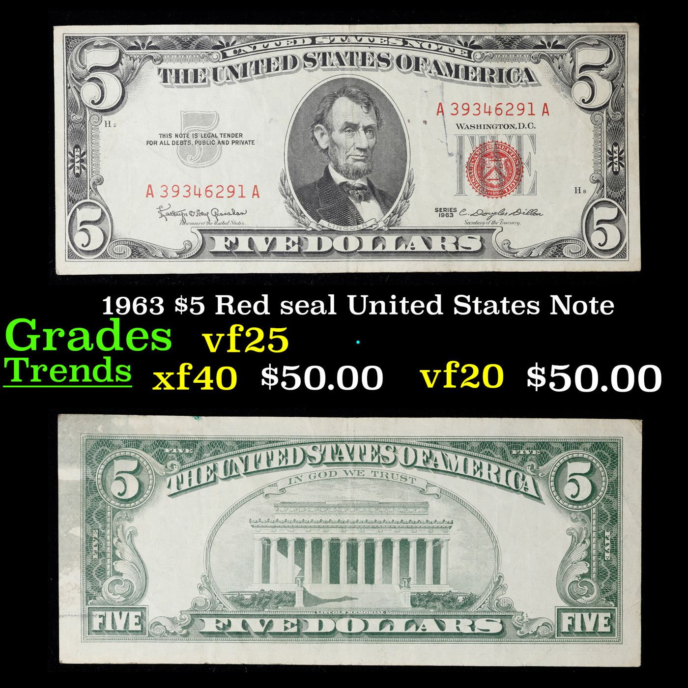 1963 $5 Red seal United States Note Grades vf+. Each 1963 five dollar red seal bill has serial number written in red ink. There is a red seal on the right hand side of the bill. All 1963 red seals were printed in Washington DC and feature a portrait of Abraham Lincoln in the center of the bill. You can also find the following wording on each bill, “United States Note, The United States of America, This Note Is A Legal Tender At Its Face Value For All Debts Public And Private, Will Pay To The Bearer On Demand Five Dollars”