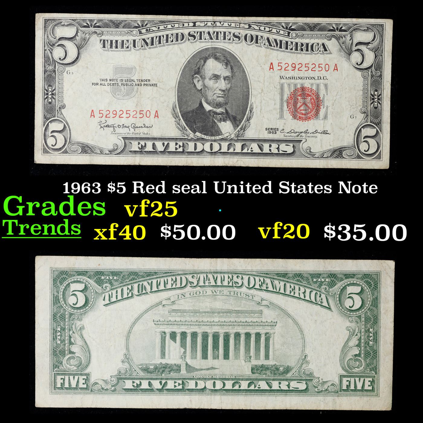 1963 $5 Red seal United States Note Grades vf+. Each 1963 five dollar red seal bill has serial number written in red ink. There is a red seal on the right hand side of the bill. All 1963 red seals were printed in Washington DC and feature a portrait of Abraham Lincoln in the center of the bill. You can also find the following wording on each bill, “United States Note, The United States of America, This Note Is A Legal Tender At Its Face Value For All Debts Public And Private, Will Pay To The Bearer On Demand Five Dollars”