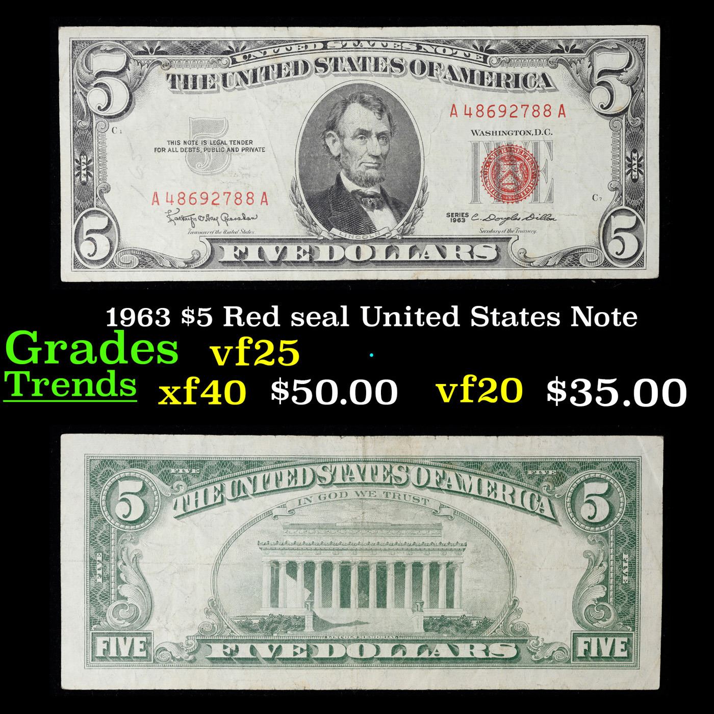 1963 $5 Red seal United States Note Grades vf+. Each 1963 five dollar red seal bill has serial number written in red ink. There is a red seal on the right hand side of the bill. All 1963 red seals were printed in Washington DC and feature a portrait of Abraham Lincoln in the center of the bill. You can also find the following wording on each bill, “United States Note, The United States of America, This Note Is A Legal Tender At Its Face Value For All Debts Public And Private, Will Pay To The Bearer On Demand Five Dollars”