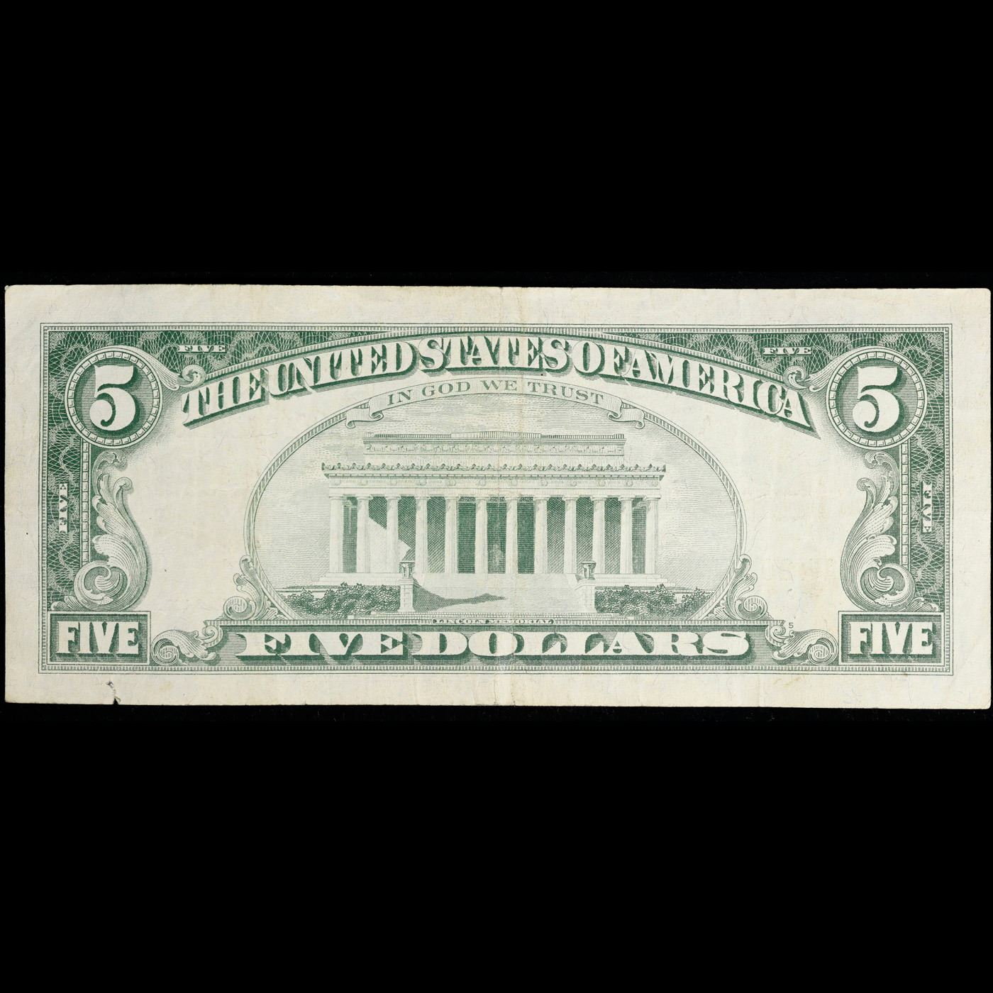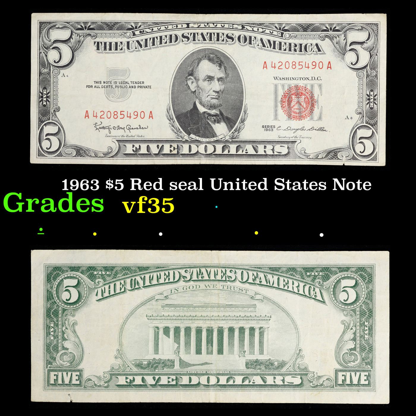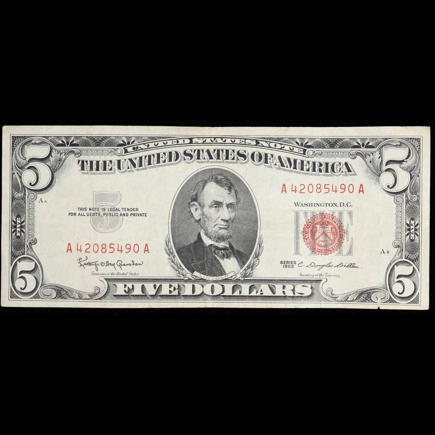 1963 $5 Red seal United States Note Grades vf++. Each 1963 five dollar red seal bill has serial number written in red ink. There is a red seal on the right hand side of the bill. All 1963 red seals were printed in Washington DC and feature a portrait of Abraham Lincoln in the center of the bill. You can also find the following wording on each bill, “United States Note, The United States of America, This Note Is A Legal Tender At Its Face Value For All Debts Public And Private, Will Pay To The Bearer On Demand Five Dollars”