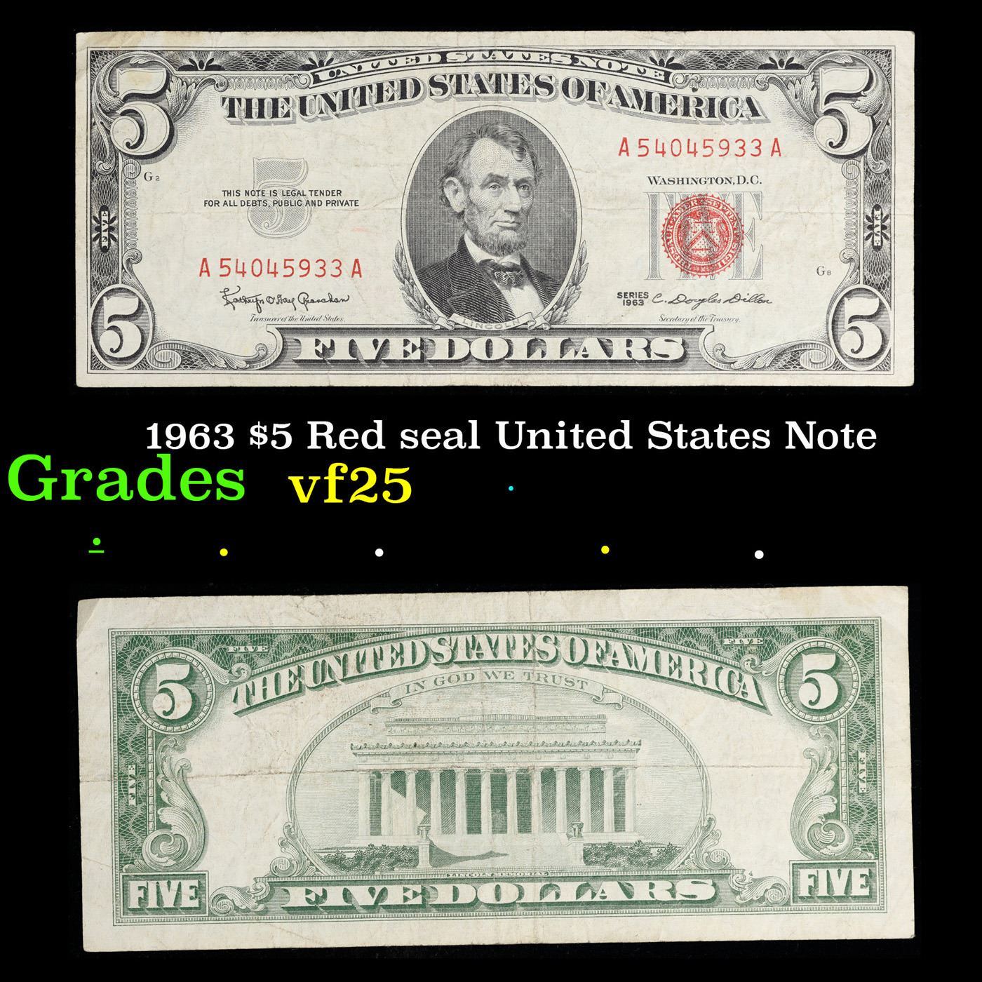 1963 $5 Red seal United States Note Grades vf+. Each 1963 five dollar red seal bill has serial number written in red ink. There is a red seal on the right hand side of the bill. All 1963 red seals were printed in Washington DC and feature a portrait of Abraham Lincoln in the center of the bill. You can also find the following wording on each bill, “United States Note, The United States of America, This Note Is A Legal Tender At Its Face Value For All Debts Public And Private, Will Pay To The Bearer On Demand Five Dollars”