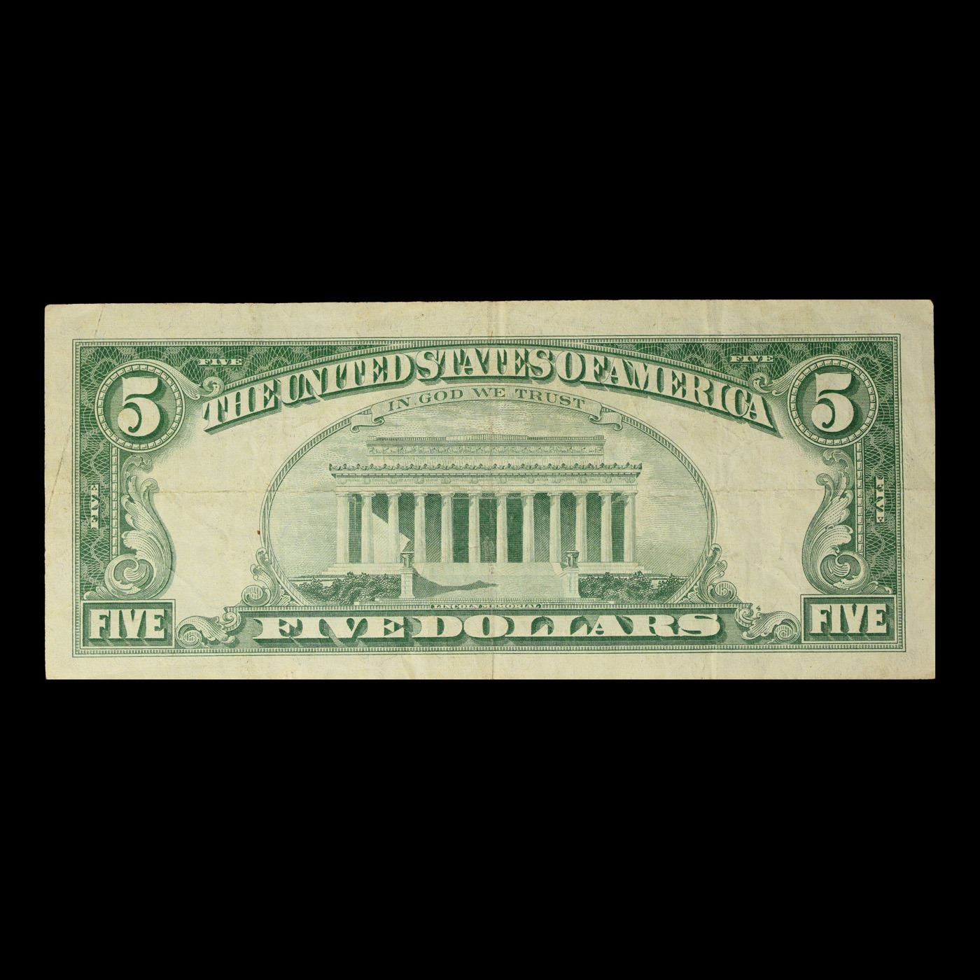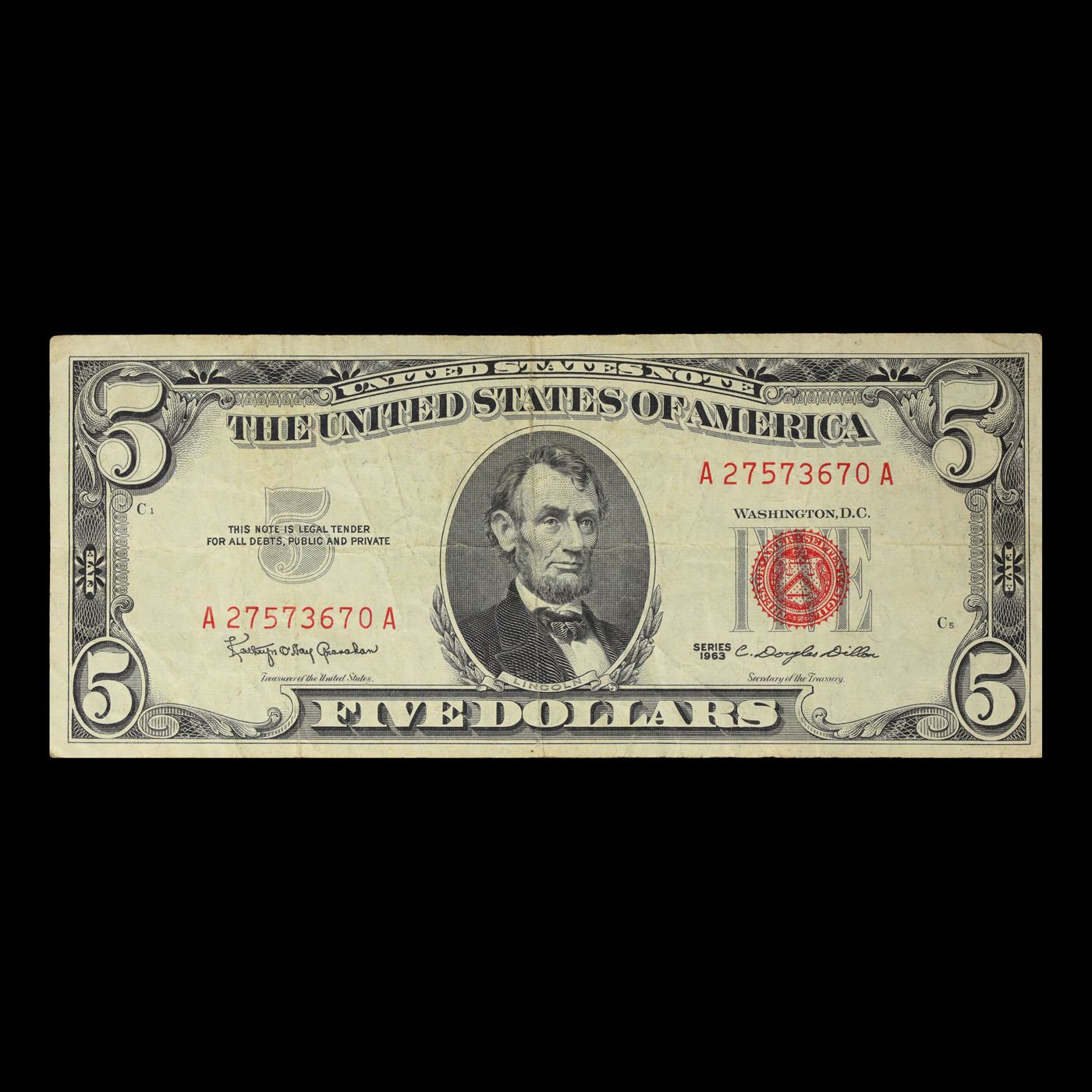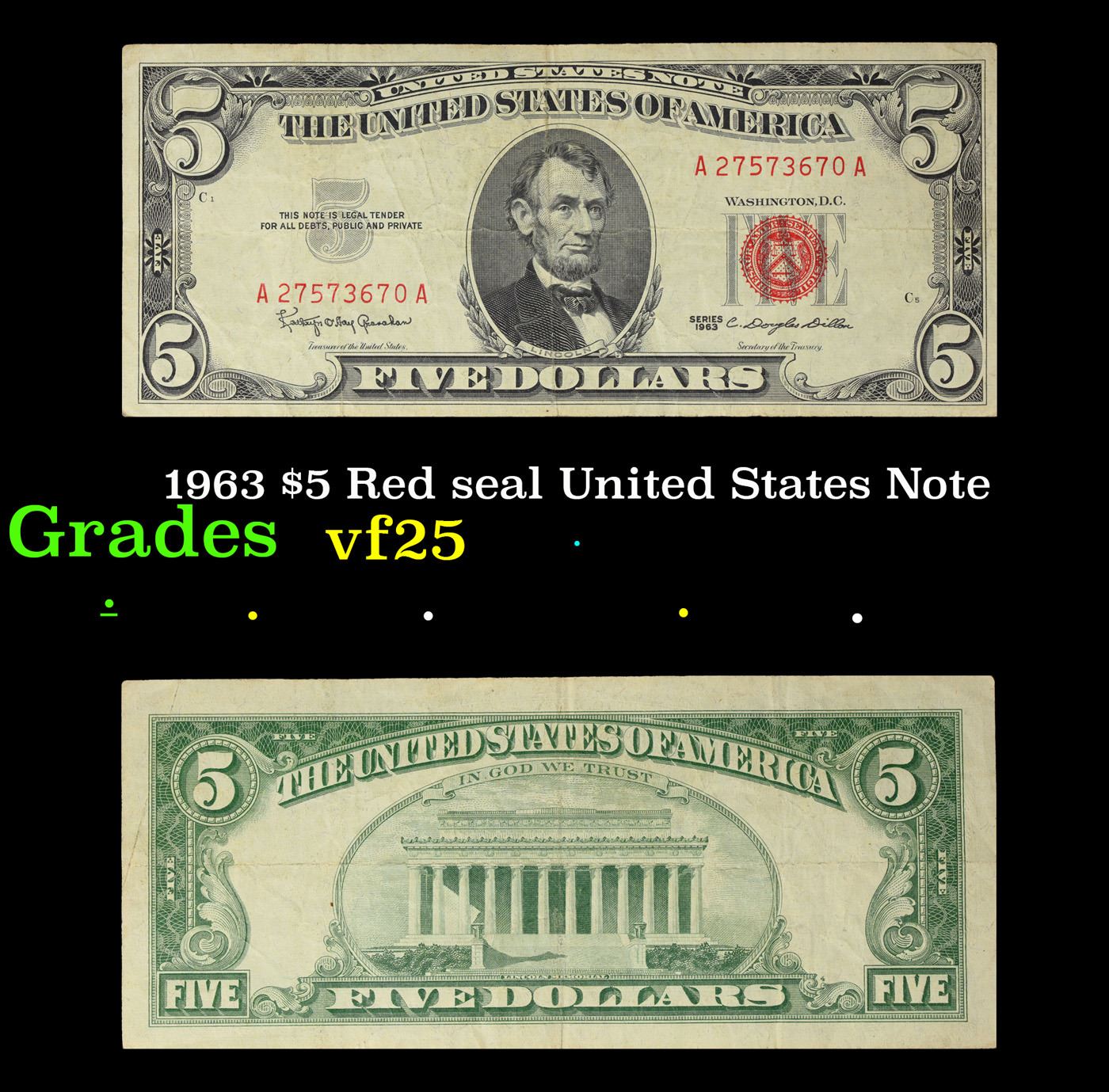 1963 $5 Red seal United States Note Grades vf+. Each 1963 five dollar red seal bill has serial number written in red ink. There is a red seal on the right hand side of the bill. All 1963 red seals were printed in Washington DC and feature a portrait of Abraham Lincoln in the center of the bill. You can also find the following wording on each bill, “United States Note, The United States of America, This Note Is A Legal Tender At Its Face Value For All Debts Public And Private, Will Pay To The Bearer On Demand Five Dollars”