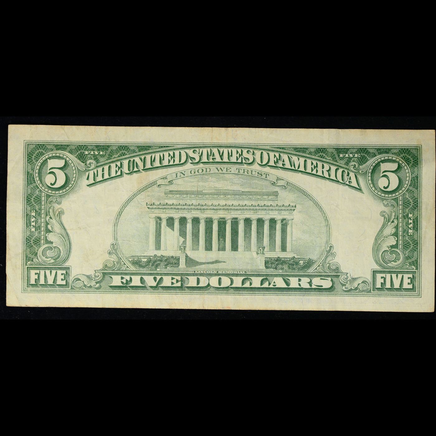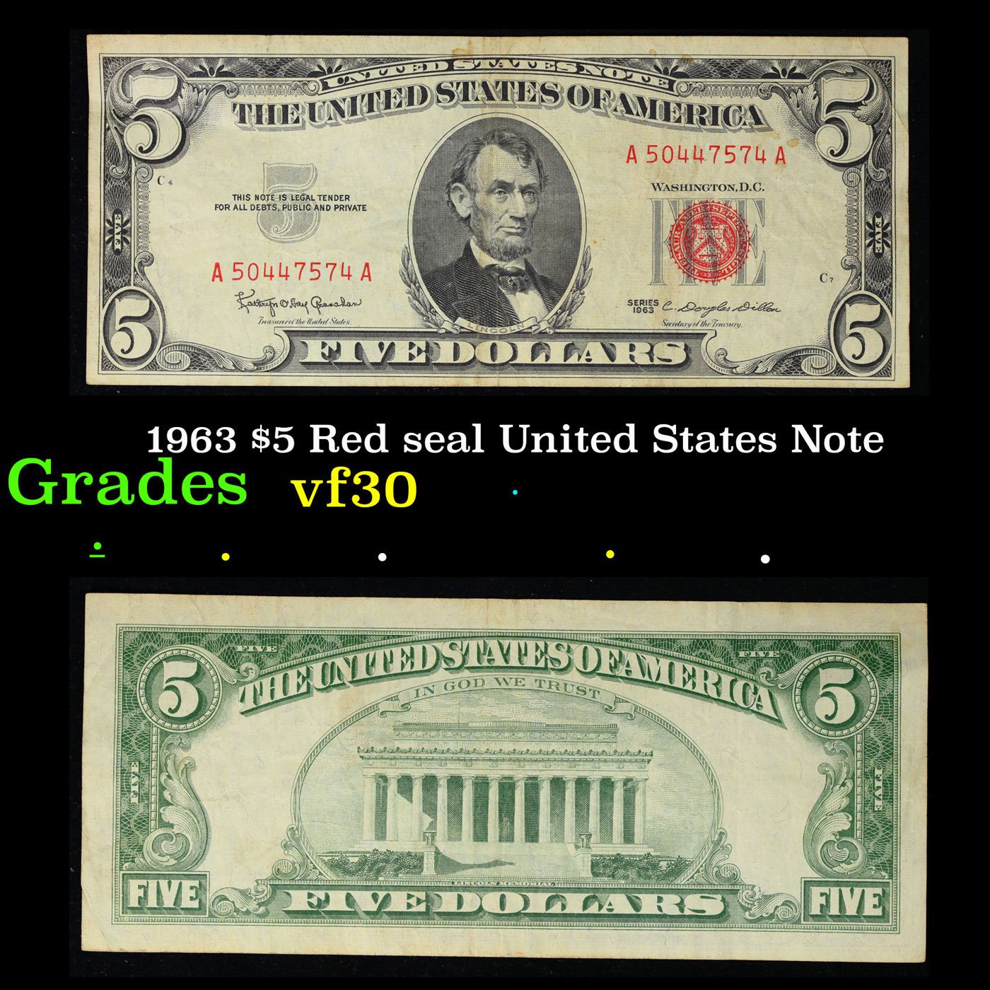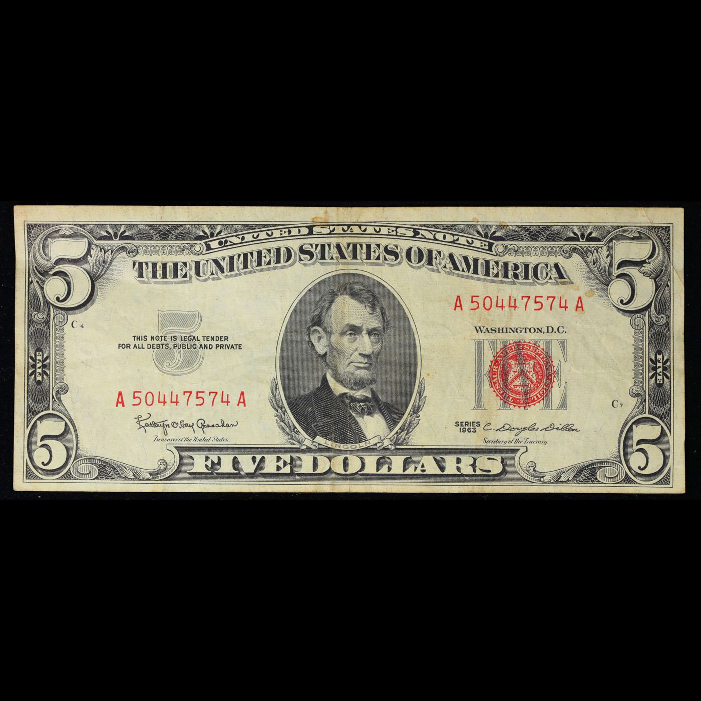 1963 $5 Red seal United States Note Grades vf++. Each 1963 five dollar red seal bill has serial number written in red ink. There is a red seal on the right hand side of the bill. All 1963 red seals were printed in Washington DC and feature a portrait of Abraham Lincoln in the center of the bill. You can also find the following wording on each bill, “United States Note, The United States of America, This Note Is A Legal Tender At Its Face Value For All Debts Public And Private, Will Pay To The Bearer On Demand Five Dollars”