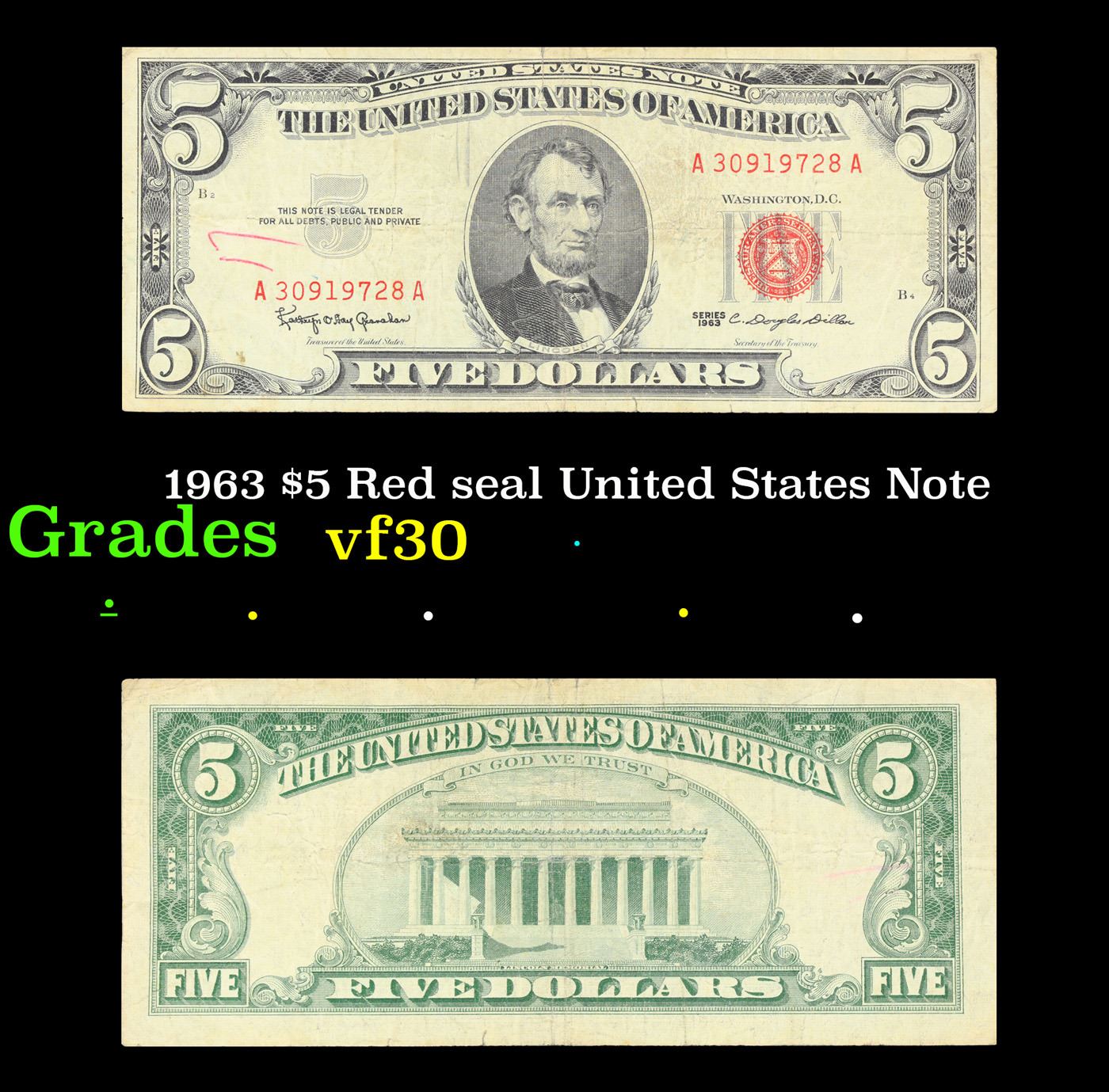 1963 $5 Red seal United States Note Grades vf++. Each 1963 five dollar red seal bill has serial number written in red ink. There is a red seal on the right hand side of the bill. All 1963 red seals were printed in Washington DC and feature a portrait of Abraham Lincoln in the center of the bill. You can also find the following wording on each bill, “United States Note, The United States of America, This Note Is A Legal Tender At Its Face Value For All Debts Public And Private, Will Pay To The Bearer On Demand Five Dollars”