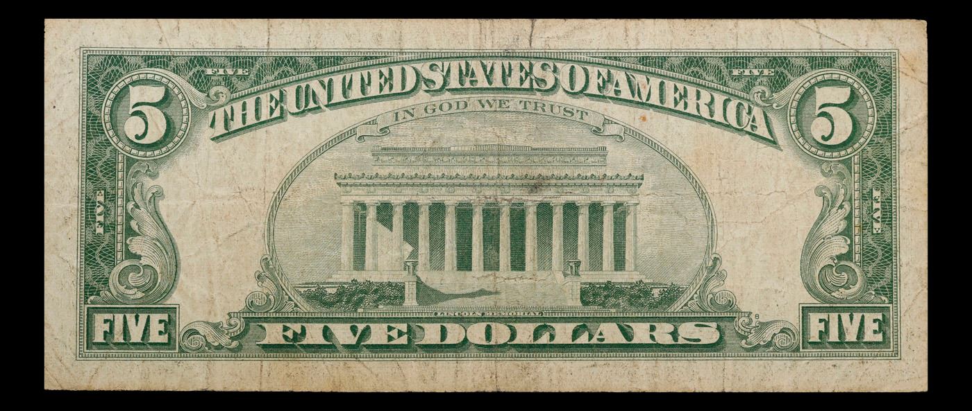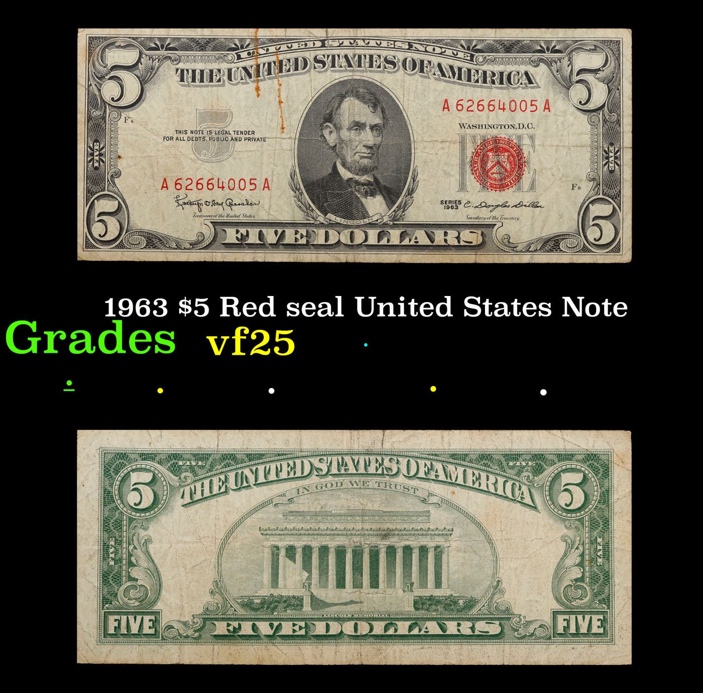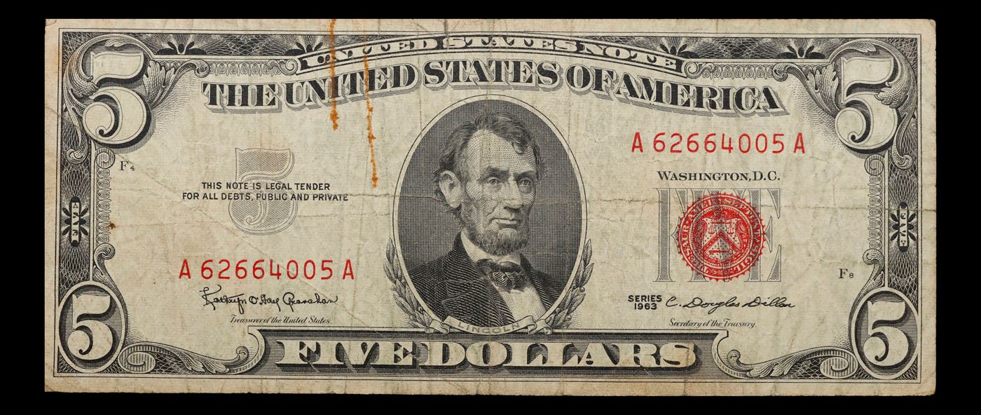 1963 $5 Red seal United States Note Grades vf+. Each 1963 five dollar red seal bill has serial number written in red ink. There is a red seal on the right hand side of the bill. All 1963 red seals were printed in Washington DC and feature a portrait of Abraham Lincoln in the center of the bill. You can also find the following wording on each bill, “United States Note, The United States of America, This Note Is A Legal Tender At Its Face Value For All Debts Public And Private, Will Pay To The Bearer On Demand Five Dollars”