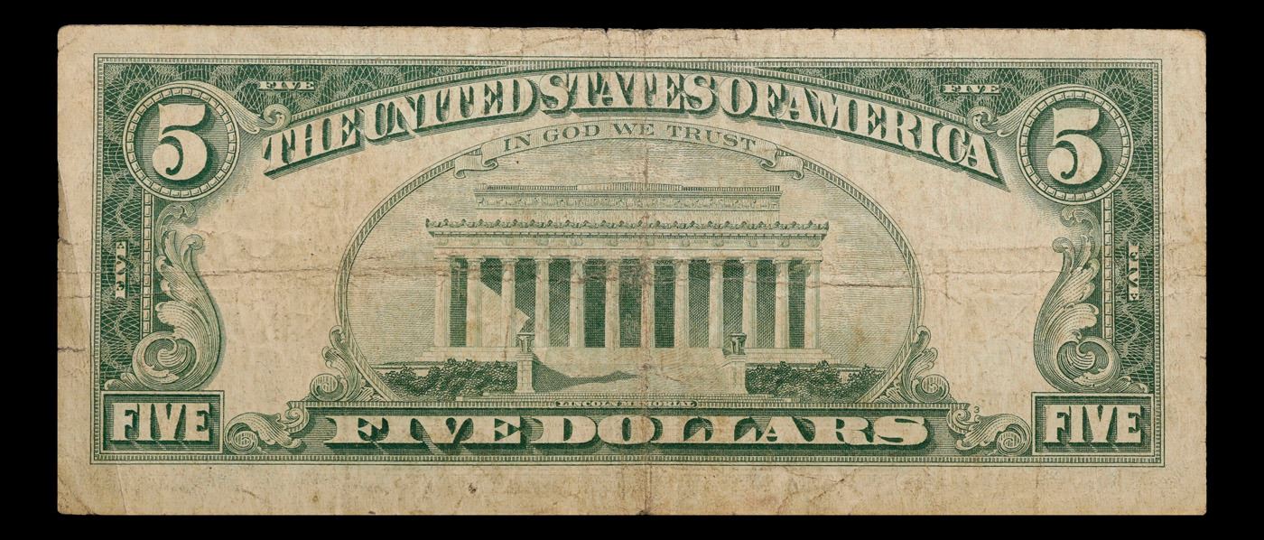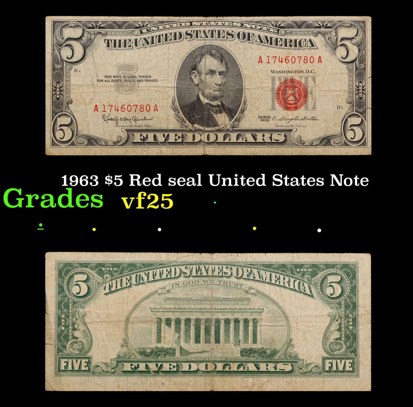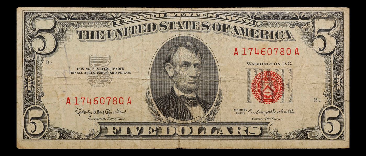 1963 $5 Red seal United States Note Grades vf+. Each 1963 five dollar red seal bill has serial number written in red ink. There is a red seal on the right hand side of the bill. All 1963 red seals were printed in Washington DC and feature a portrait of Abraham Lincoln in the center of the bill. You can also find the following wording on each bill, “United States Note, The United States of America, This Note Is A Legal Tender At Its Face Value For All Debts Public And Private, Will Pay To The Bearer On Demand Five Dollars”