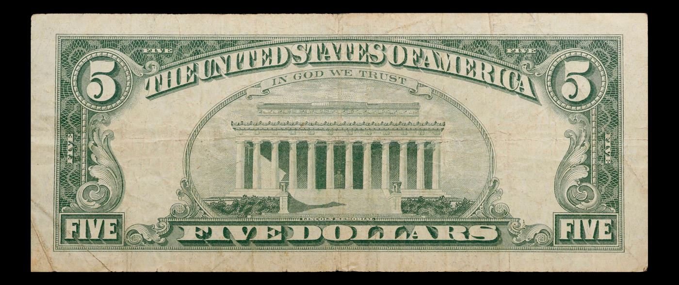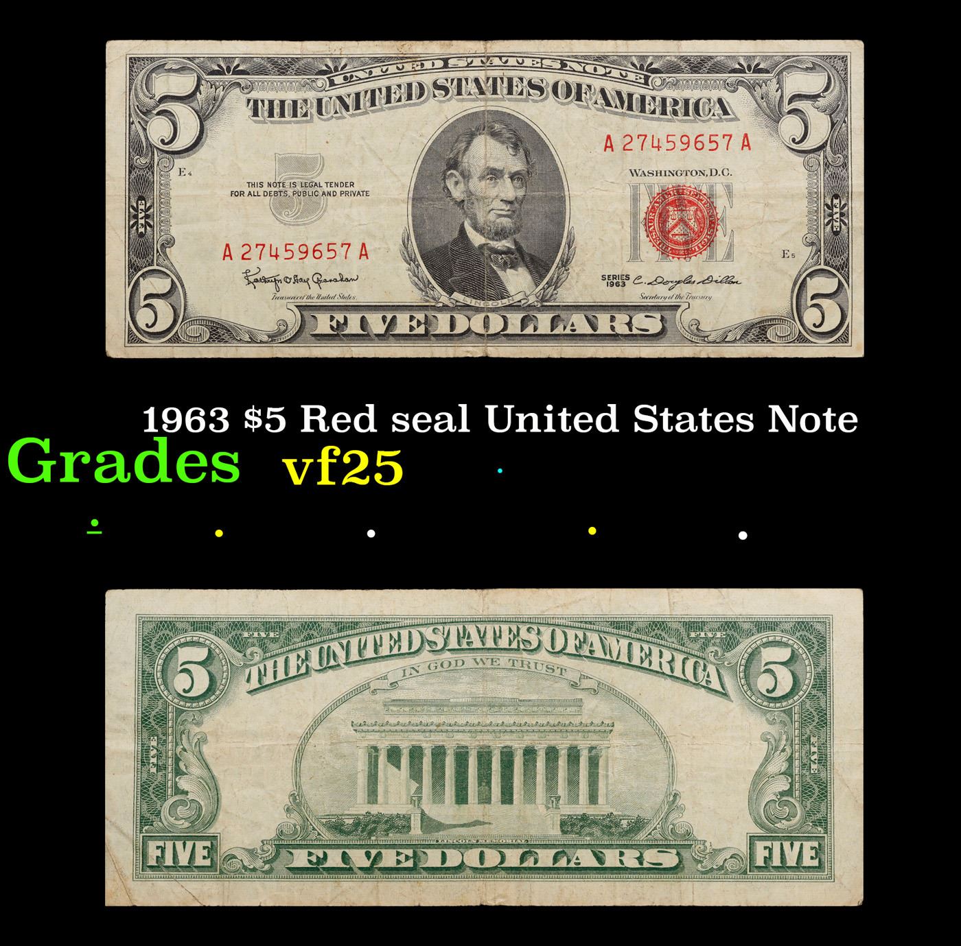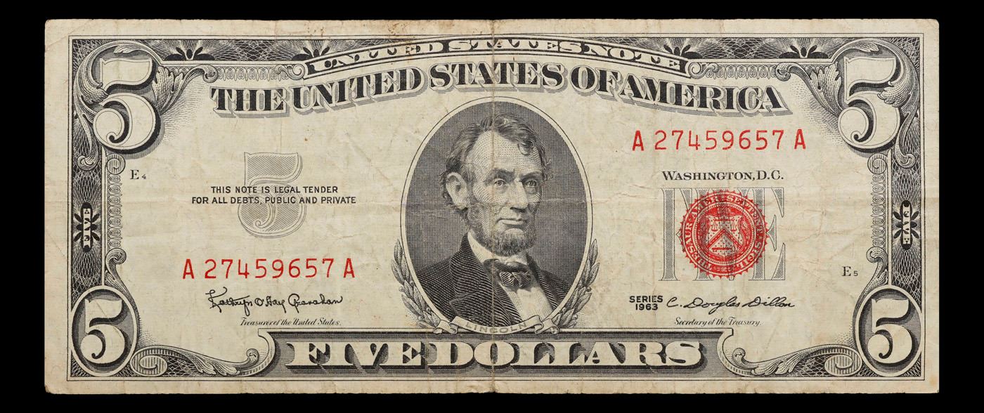 1963 $5 Red seal United States Note Grades vf+. Each 1963 five dollar red seal bill has serial number written in red ink. There is a red seal on the right hand side of the bill. All 1963 red seals were printed in Washington DC and feature a portrait of Abraham Lincoln in the center of the bill. You can also find the following wording on each bill, “United States Note, The United States of America, This Note Is A Legal Tender At Its Face Value For All Debts Public And Private, Will Pay To The Bearer On Demand Five Dollars”
