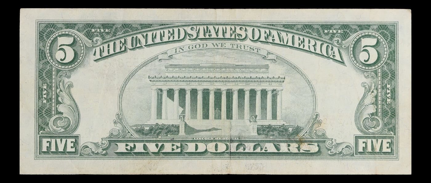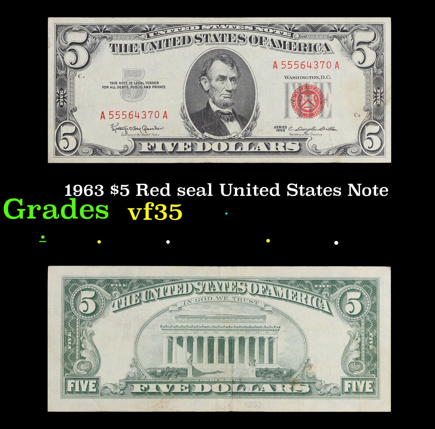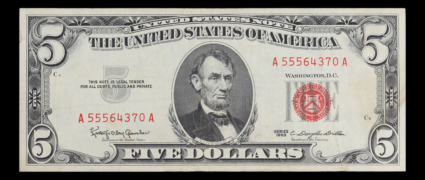 1963 $5 Red seal United States Note Grades vf++. Each 1963 five dollar red seal bill has serial number written in red ink. There is a red seal on the right hand side of the bill. All 1963 red seals were printed in Washington DC and feature a portrait of Abraham Lincoln in the center of the bill. You can also find the following wording on each bill, “United States Note, The United States of America, This Note Is A Legal Tender At Its Face Value For All Debts Public And Private, Will Pay To The Bearer On Demand Five Dollars”