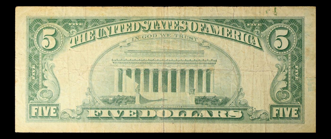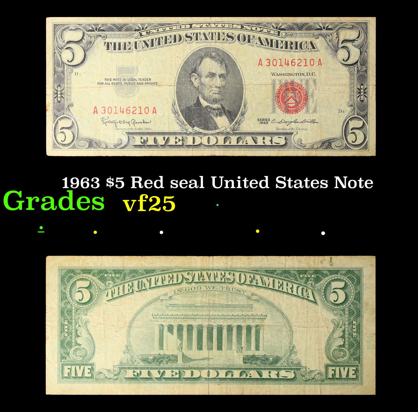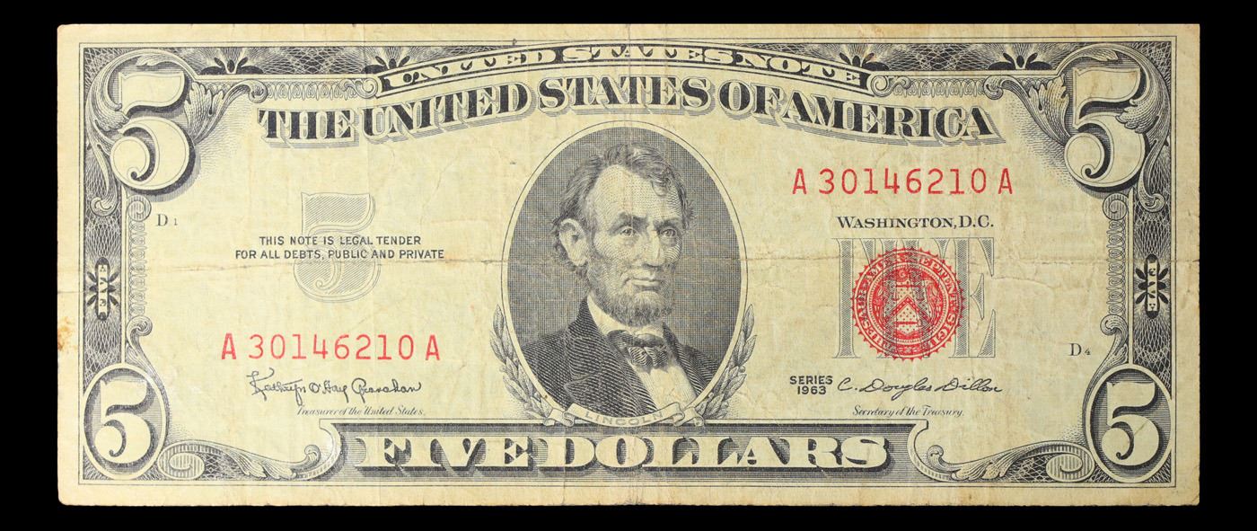1963 $5 Red seal United States Note Grades vf+. Each 1963 five dollar red seal bill has serial number written in red ink. There is a red seal on the right hand side of the bill. All 1963 red seals were printed in Washington DC and feature a portrait of Abraham Lincoln in the center of the bill. You can also find the following wording on each bill, “United States Note, The United States of America, This Note Is A Legal Tender At Its Face Value For All Debts Public And Private, Will Pay To The Bearer On Demand Five Dollars”