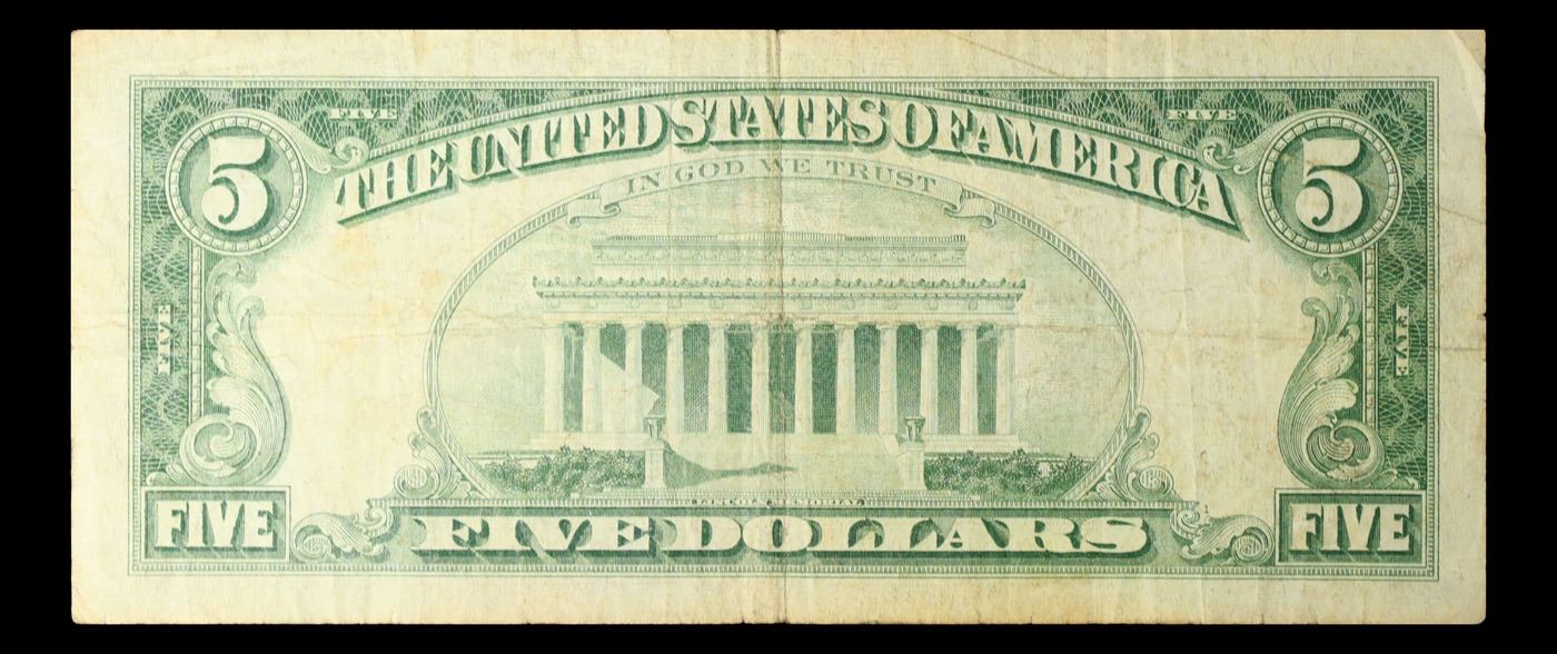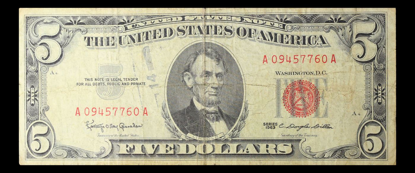1963 $5 Red seal United States Note Grades vf+. Each 1963 five dollar red seal bill has serial number written in red ink. There is a red seal on the right hand side of the bill. All 1963 red seals were printed in Washington DC and feature a portrait of Abraham Lincoln in the center of the bill. You can also find the following wording on each bill, “United States Note, The United States of America, This Note Is A Legal Tender At Its Face Value For All Debts Public And Private, Will Pay To The Bearer On Demand Five Dollars”