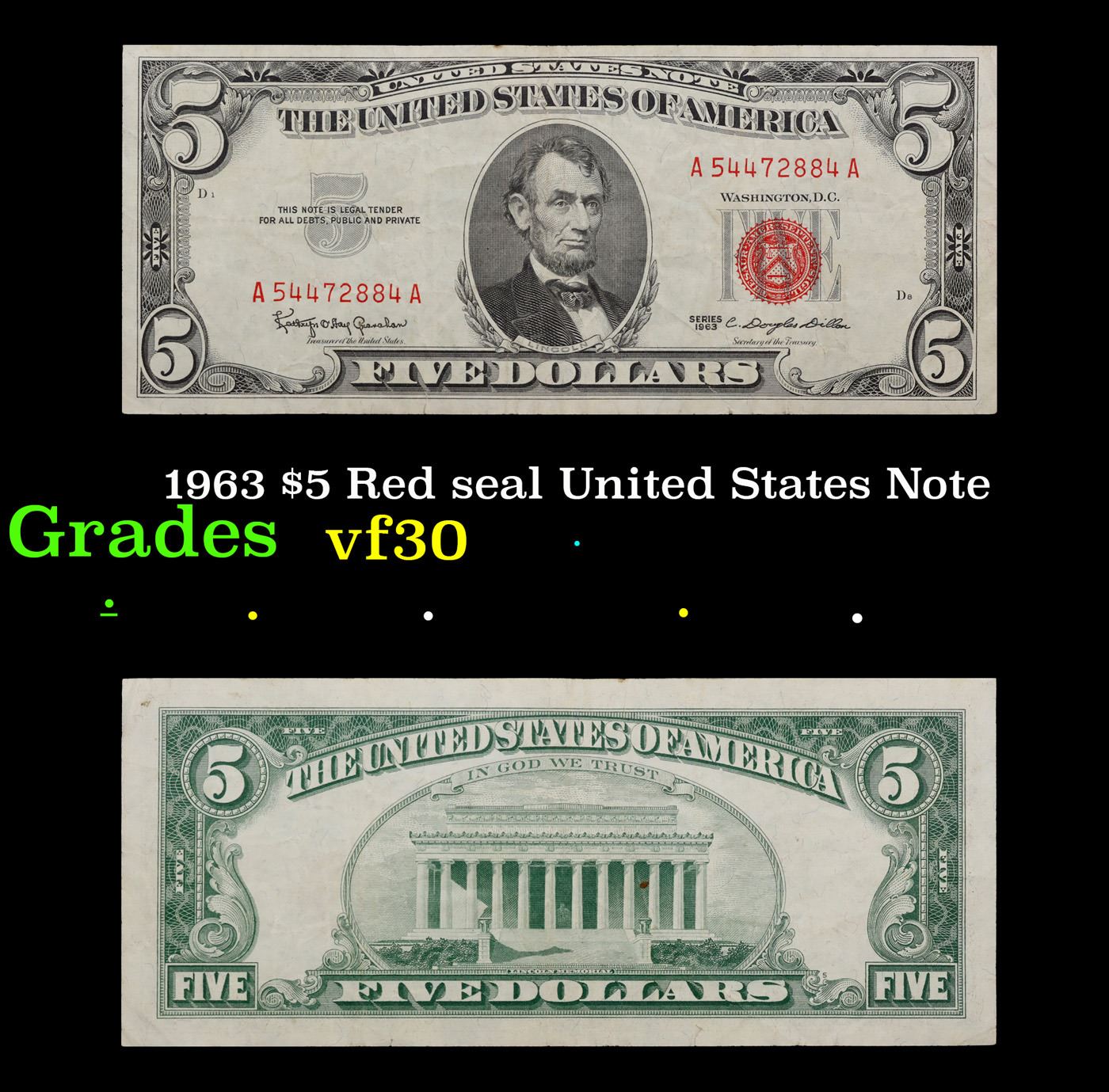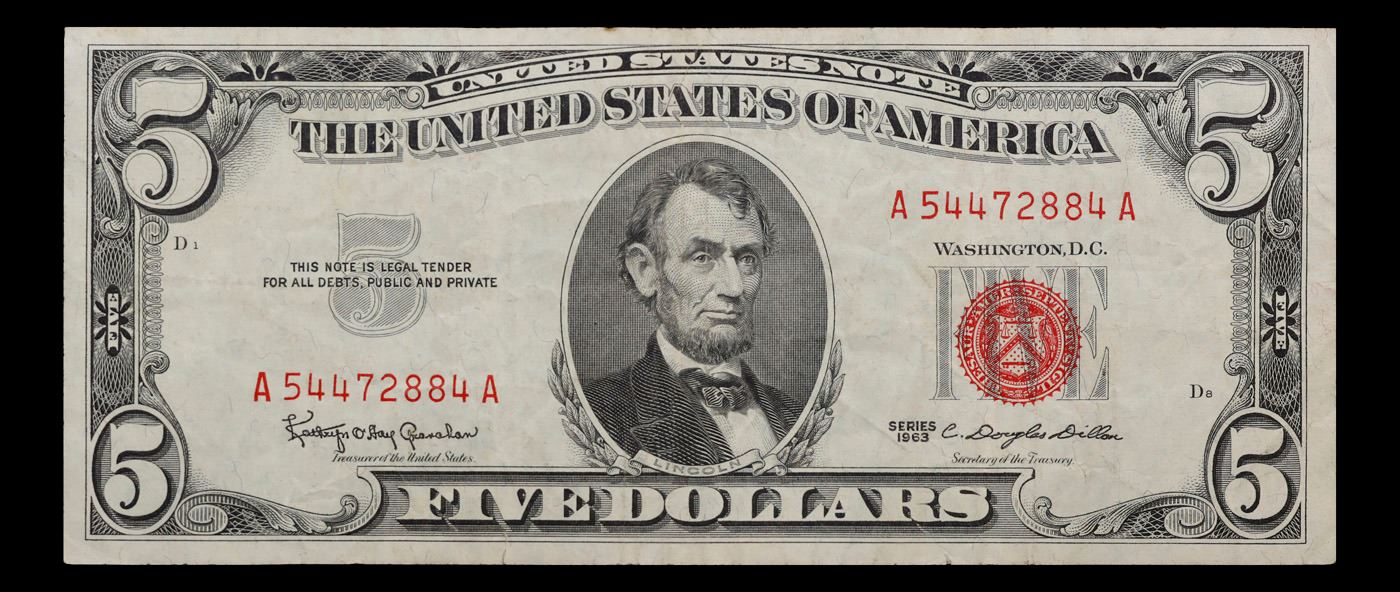 1963 $5 Red seal United States Note Grades vf++. Each 1963 five dollar red seal bill has serial number written in red ink. There is a red seal on the right hand side of the bill. All 1963 red seals were printed in Washington DC and feature a portrait of Abraham Lincoln in the center of the bill. You can also find the following wording on each bill, “United States Note, The United States of America, This Note Is A Legal Tender At Its Face Value For All Debts Public And Private, Will Pay To The Bearer On Demand Five Dollars”
