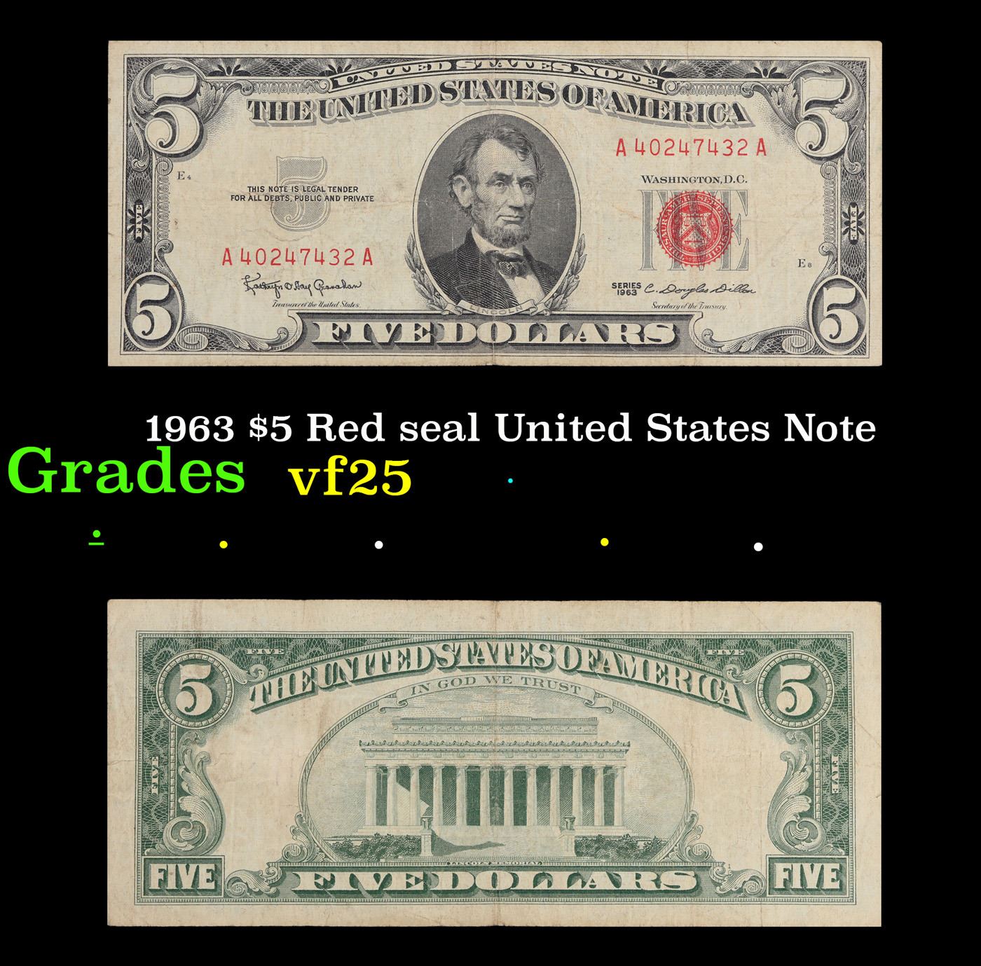 1963 $5 Red seal United States Note Grades vf+. Each 1963 five dollar red seal bill has serial number written in red ink. There is a red seal on the right hand side of the bill. All 1963 red seals were printed in Washington DC and feature a portrait of Abraham Lincoln in the center of the bill. You can also find the following wording on each bill, ÒUnited States Note, The United States of America, This Note Is A Legal Tender At Its Face Value For All Debts Public And Private, Will Pay To The Bearer On Demand Five DollarsÓ
