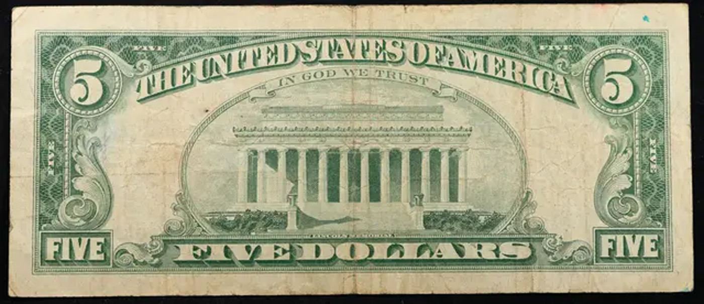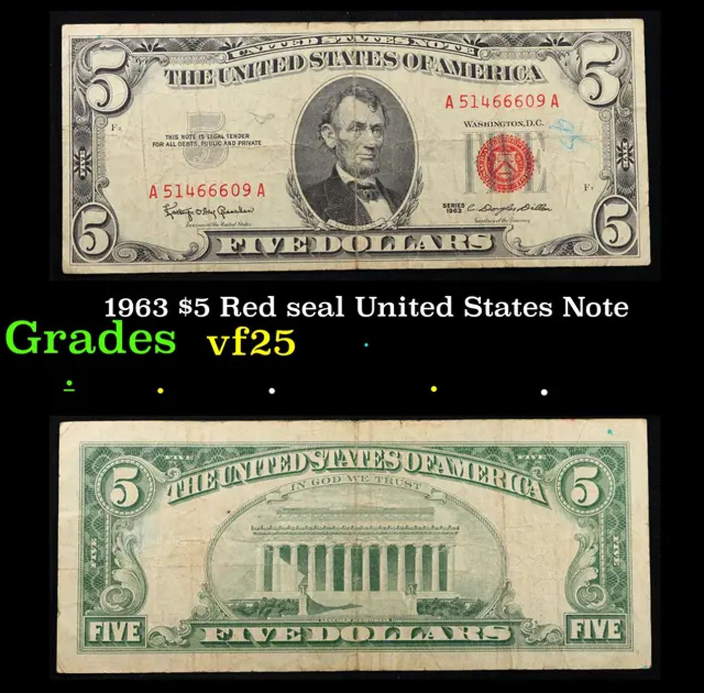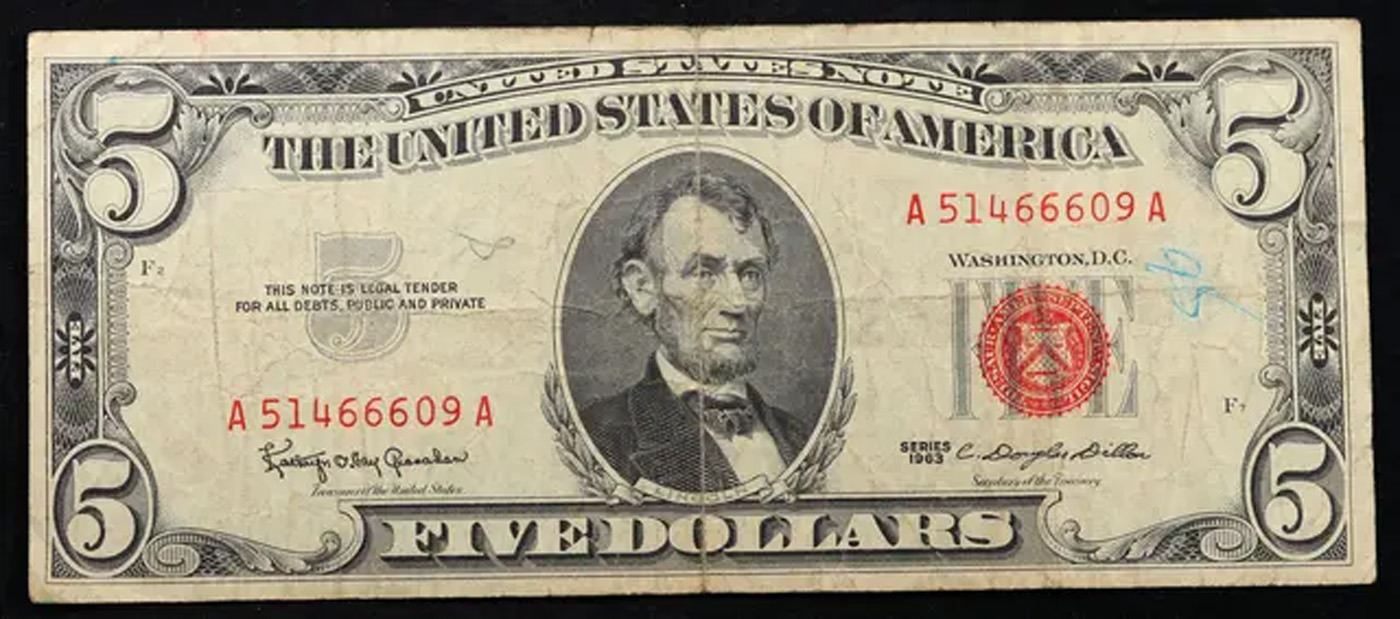 1963 $5 Red seal United States Note Grades vf+. Each 1963 five dollar red seal bill has serial number written in red ink. There is a red seal on the right hand side of the bill. All 1963 red seals were printed in Washington DC and feature a portrait of Abraham Lincoln in the center of the bill. You can also find the following wording on each bill, “United States Note, The United States of America, This Note Is A Legal Tender At Its Face Value For All Debts Public And Private, Will Pay To The Bearer On Demand Five Dollars”