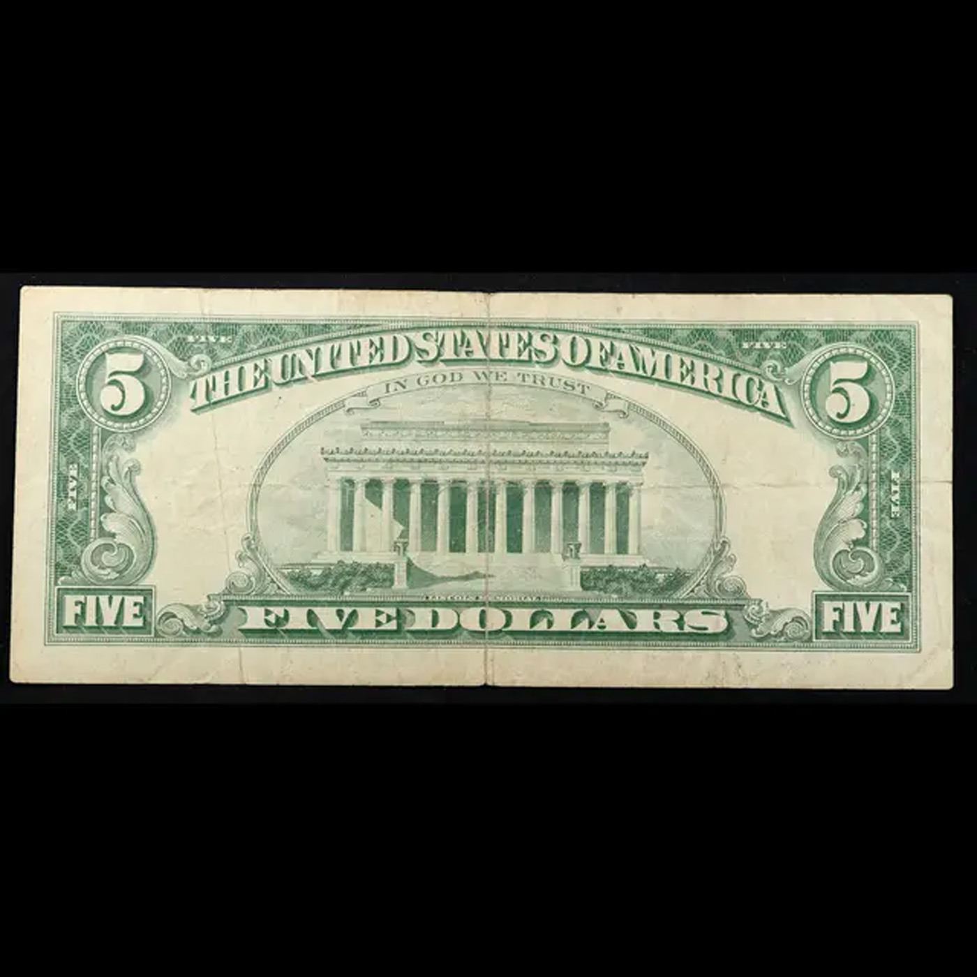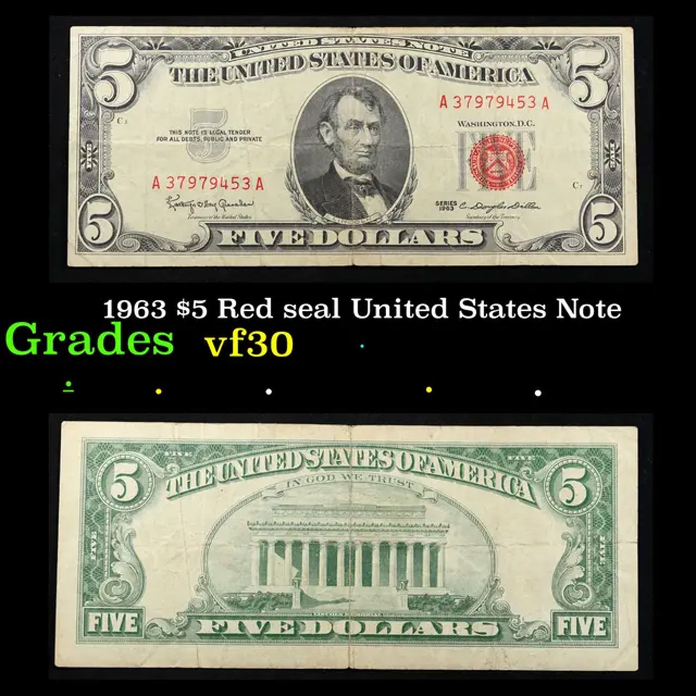 1963 $5 Red seal United States Note Grades vf++. Each 1963 five dollar red seal bill has serial number written in red ink. There is a red seal on the right hand side of the bill. All 1963 red seals were printed in Washington DC and feature a portrait of Abraham Lincoln in the center of the bill. You can also find the following wording on each bill, “United States Note, The United States of America, This Note Is A Legal Tender At Its Face Value For All Debts Public And Private, Will Pay To The Bearer On Demand Five Dollars”
