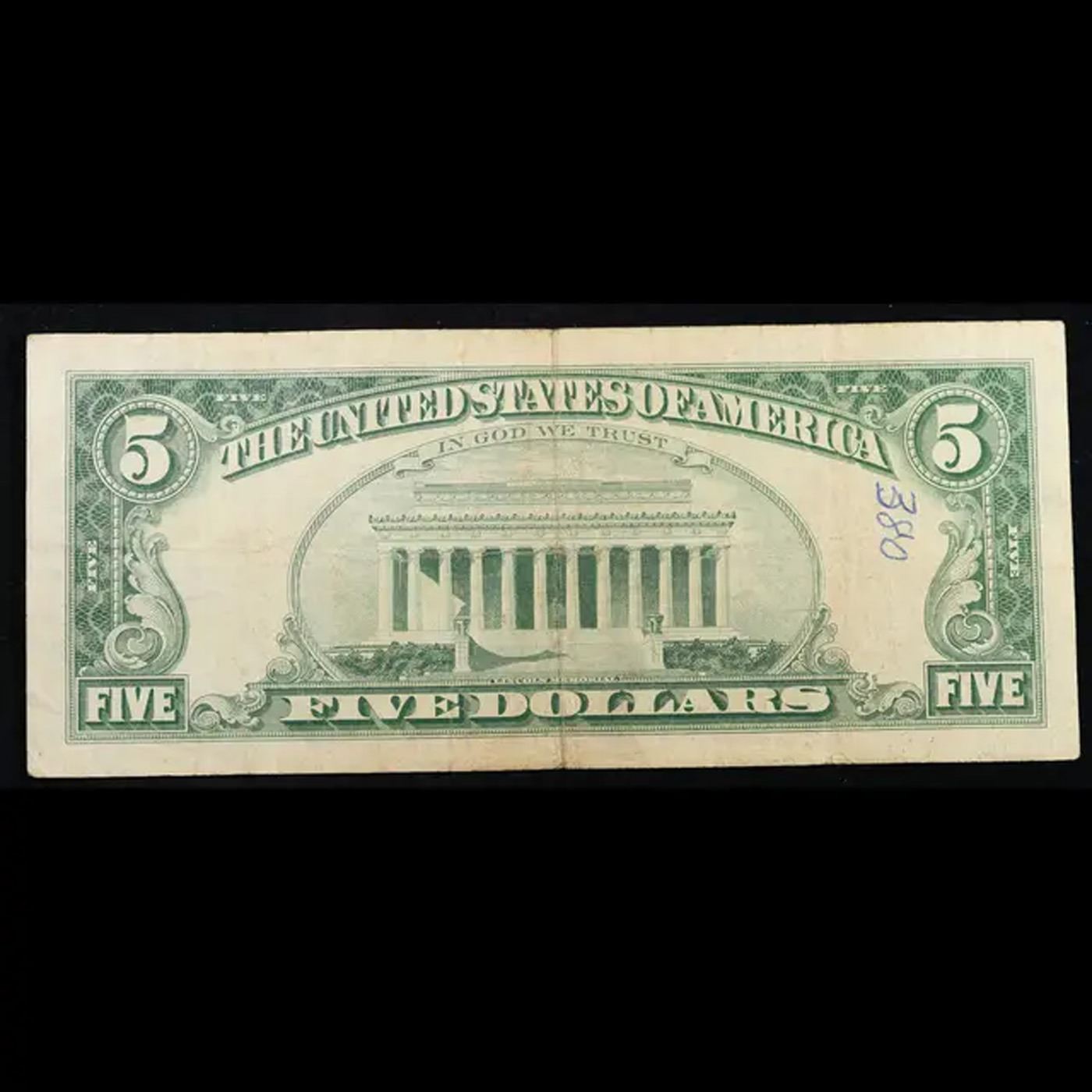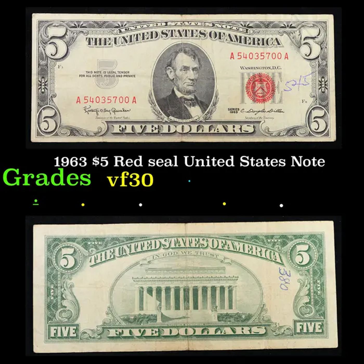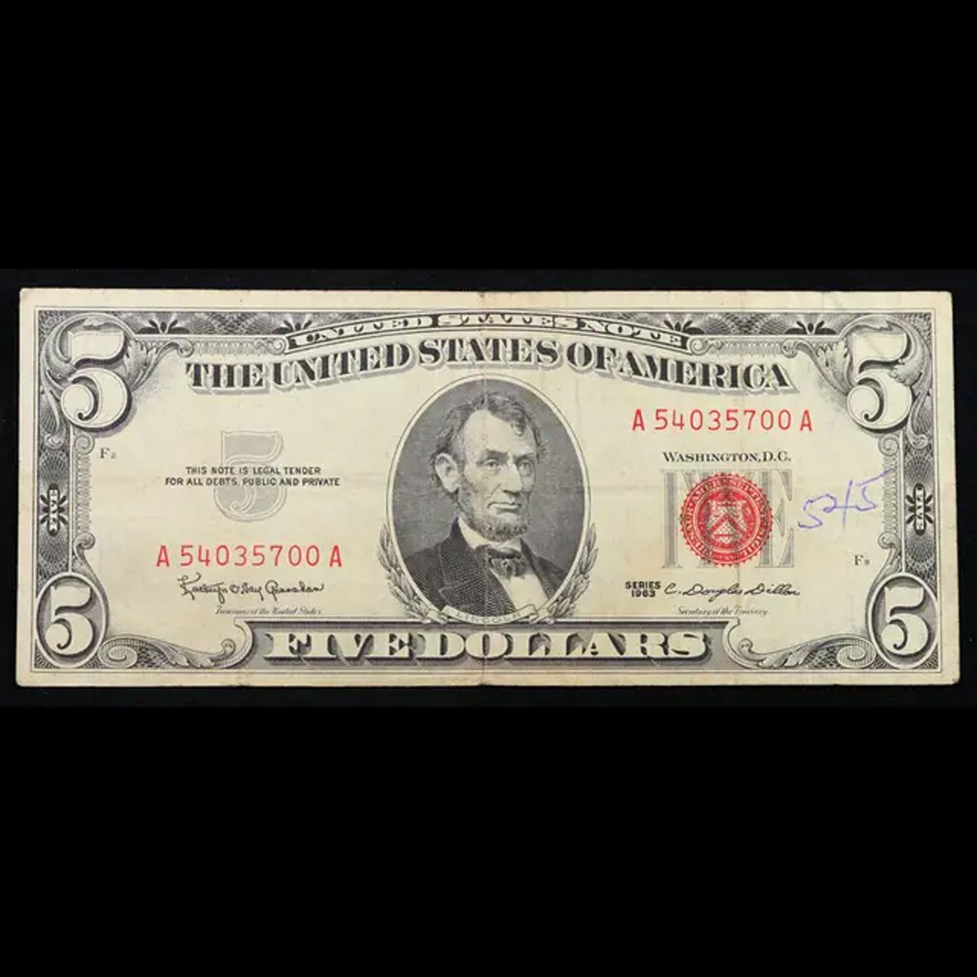 1963 $5 Red seal United States Note Grades vf++. Each 1963 five dollar red seal bill has serial number written in red ink. There is a red seal on the right hand side of the bill. All 1963 red seals were printed in Washington DC and feature a portrait of Abraham Lincoln in the center of the bill. You can also find the following wording on each bill, “United States Note, The United States of America, This Note Is A Legal Tender At Its Face Value For All Debts Public And Private, Will Pay To The Bearer On Demand Five Dollars”