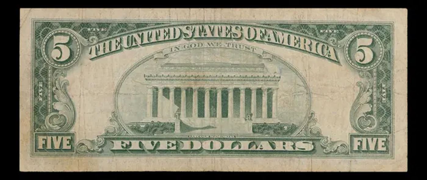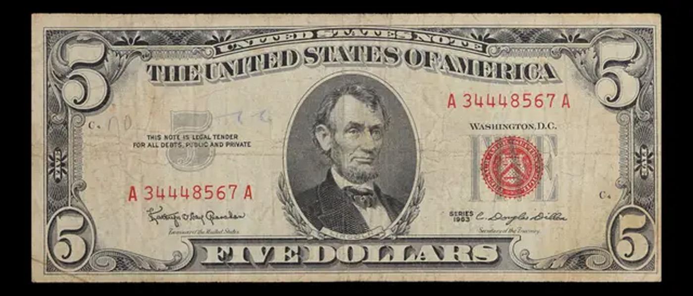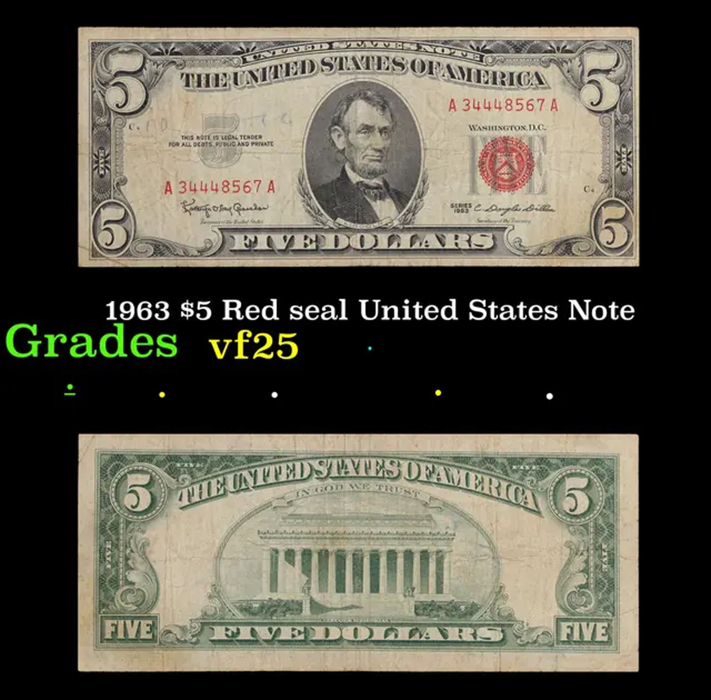 1963 $5 Red seal United States Note Grades vf+. Each 1963 five dollar red seal bill has serial number written in red ink. There is a red seal on the right hand side of the bill. All 1963 red seals were printed in Washington DC and feature a portrait of Abraham Lincoln in the center of the bill. You can also find the following wording on each bill, “United States Note, The United States of America, This Note Is A Legal Tender At Its Face Value For All Debts Public And Private, Will Pay To The Bearer On Demand Five Dollars”