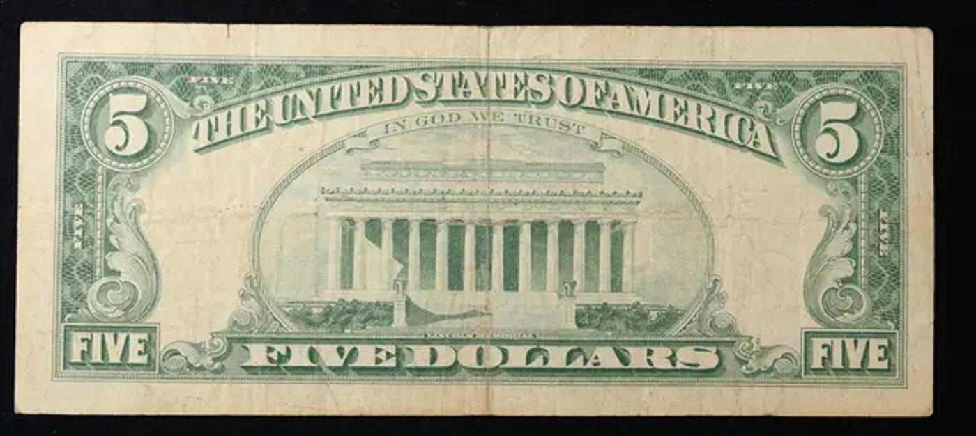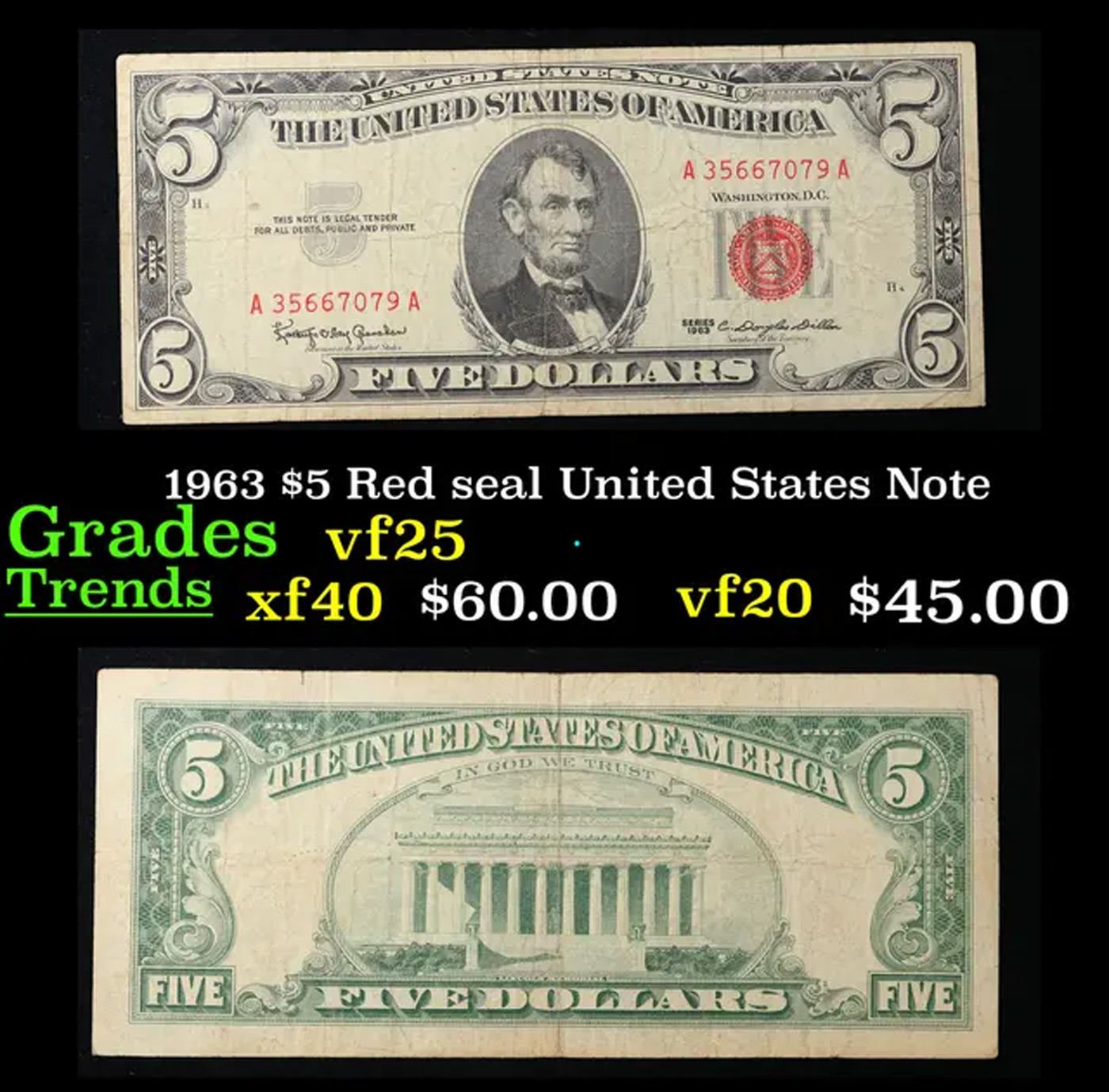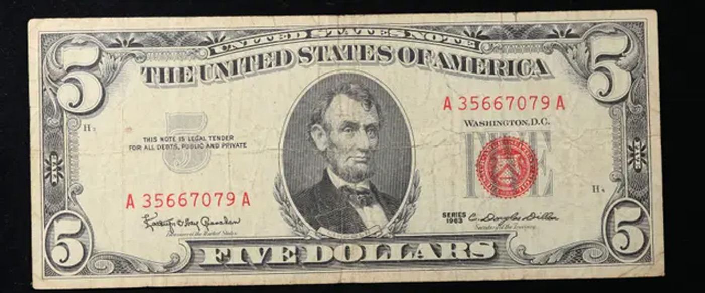 1963 $5 Red seal United States Note Grades vf+.