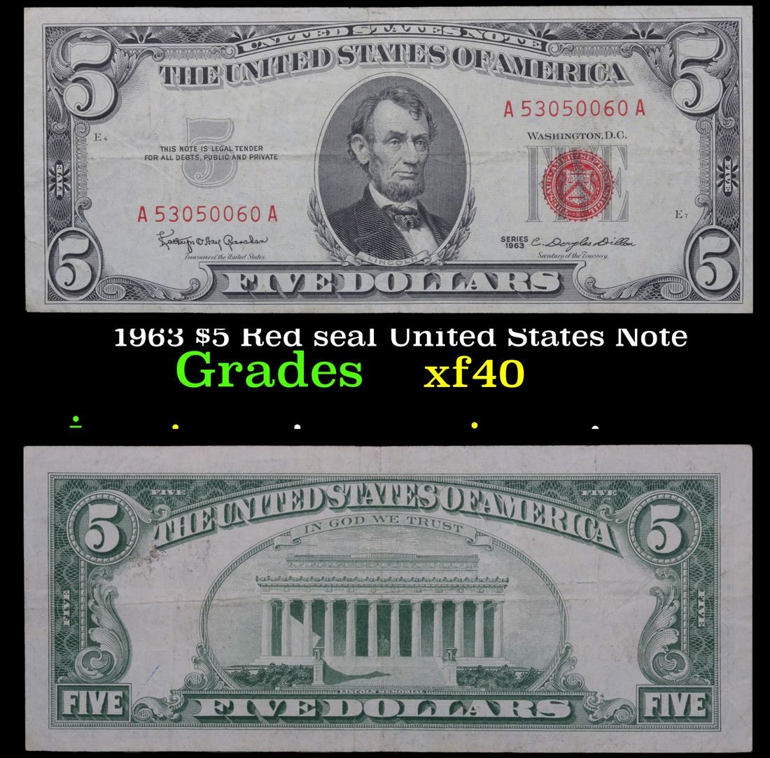 1963 $5 Red seal United States Note . . Grades xf. Each 1963 five dollar red seal bill has serial number written in red ink. There is a red seal on the right hand side of the bill. All 1963 red seals were printed in Washington DC and feature a portrait of Abraham Lincoln in the center of the bill. You can also find the following wording on each bill, “United States Note, The United States of America, This Note Is A Legal Tender At Its Face Value For All Debts Public And Private, Will Pay To The Bearer On Demand Five Dollars”