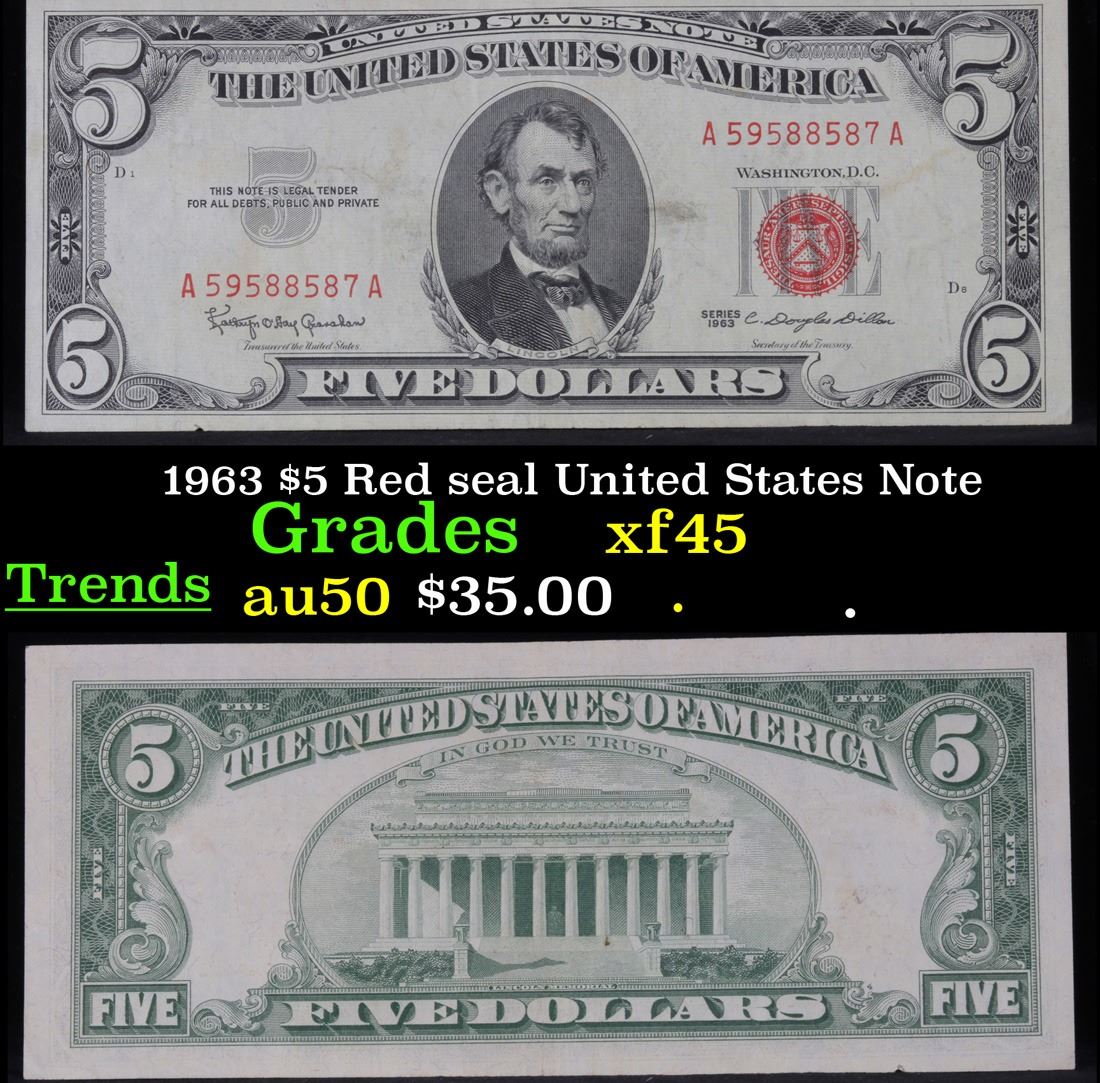 1963 $5 Red seal United States Note . . Grades xf+. Each 1963 five dollar red seal bill has serial number written in red ink. There is a red seal on the right hand side of the bill. All 1963 red seals were printed in Washington DC and feature a portrait of Abraham Lincoln in the center of the bill. You can also find the following wording on each bill, ÒUnited States Note, The United States of America, This Note Is A Legal Tender At Its Face Value For All Debts Public And Private, Will Pay To The Bearer On Demand Five DollarsÓ
