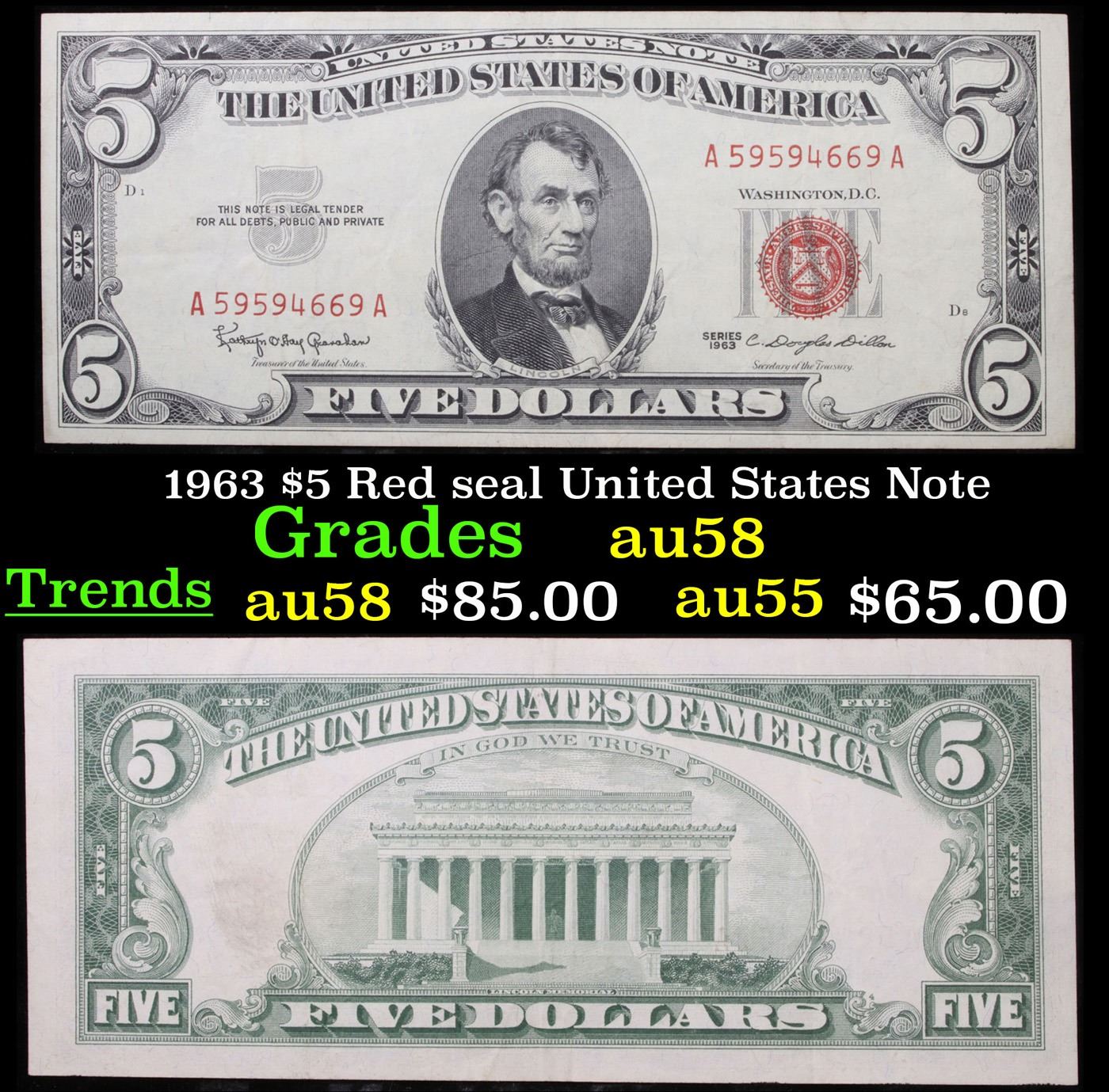 1963 $5 Red seal United States Note Grades xf+. Each 1963 five dollar red seal bill has serial number written in red ink. There is a red seal on the right hand side of the bill. All 1963 red seals were printed in Washington DC and feature a portrait of Abraham Lincoln in the center of the bill. You can also find the following wording on each bill, “United States Note, The United States of America, This Note Is A Legal Tender At Its Face Value For All Debts Public And Private, Will Pay To The Bearer On Demand Five Dollars”