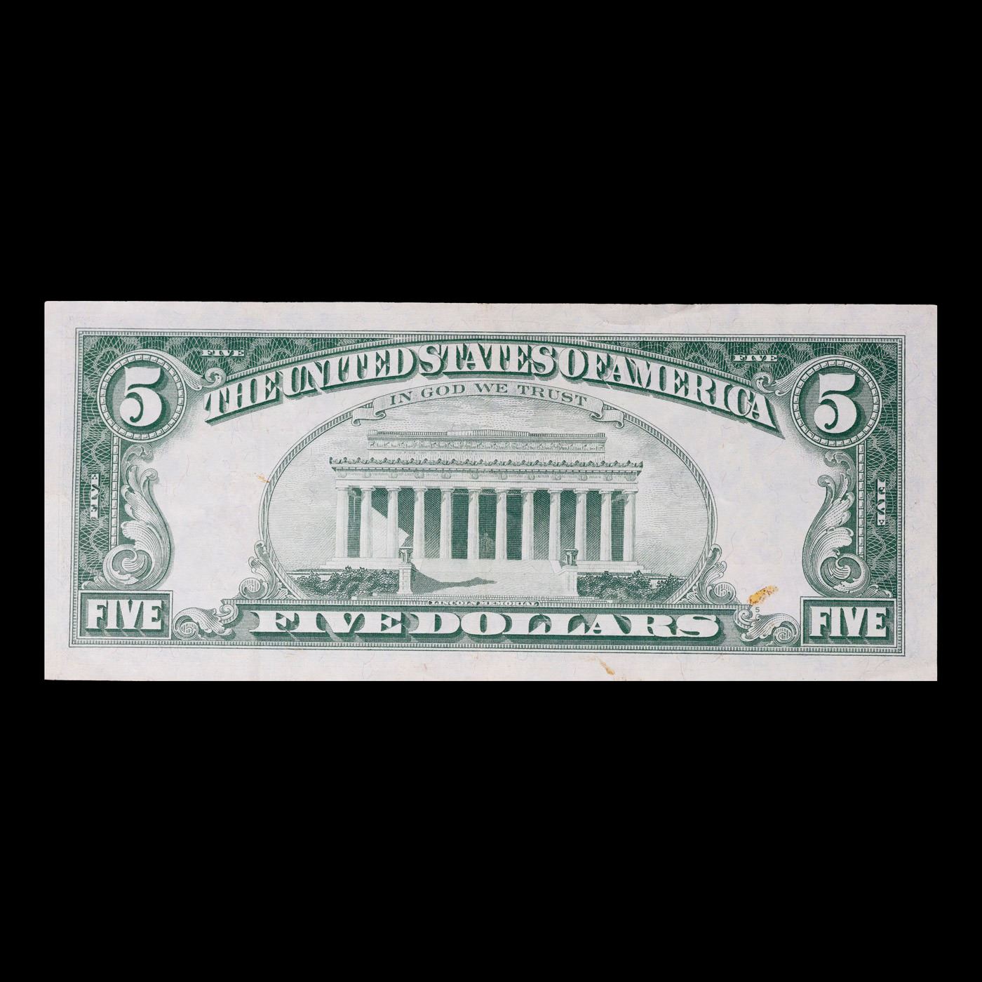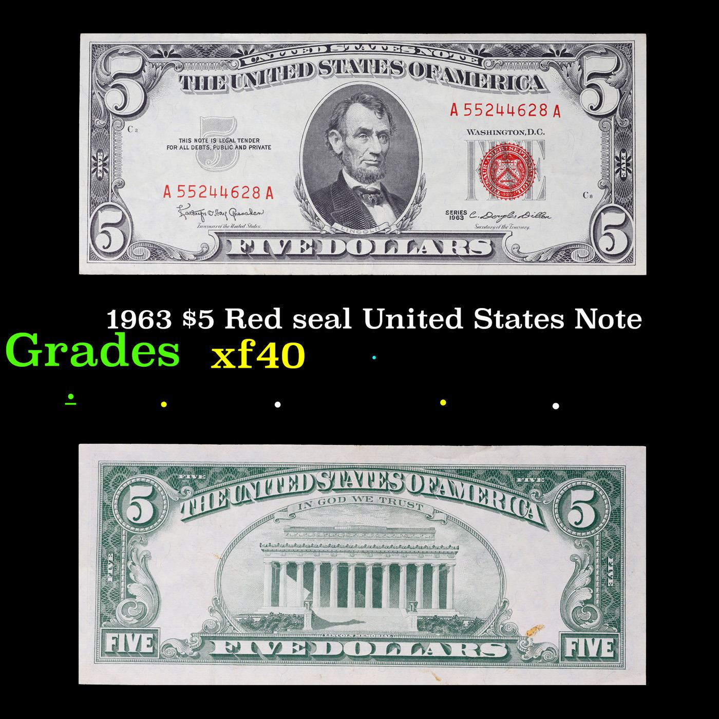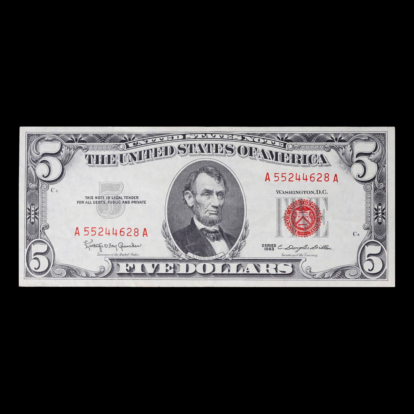 1963 $5 Red seal United States Note Grades xf. Each 1963 five dollar red seal bill has serial number written in red ink. There is a red seal on the right hand side of the bill. All 1963 red seals were printed in Washington DC and feature a portrait of Abraham Lincoln in the center of the bill. You can also find the following wording on each bill, “United States Note, The United States of America, This Note Is A Legal Tender At Its Face Value For All Debts Public And Private, Will Pay To The Bearer On Demand Five Dollars”