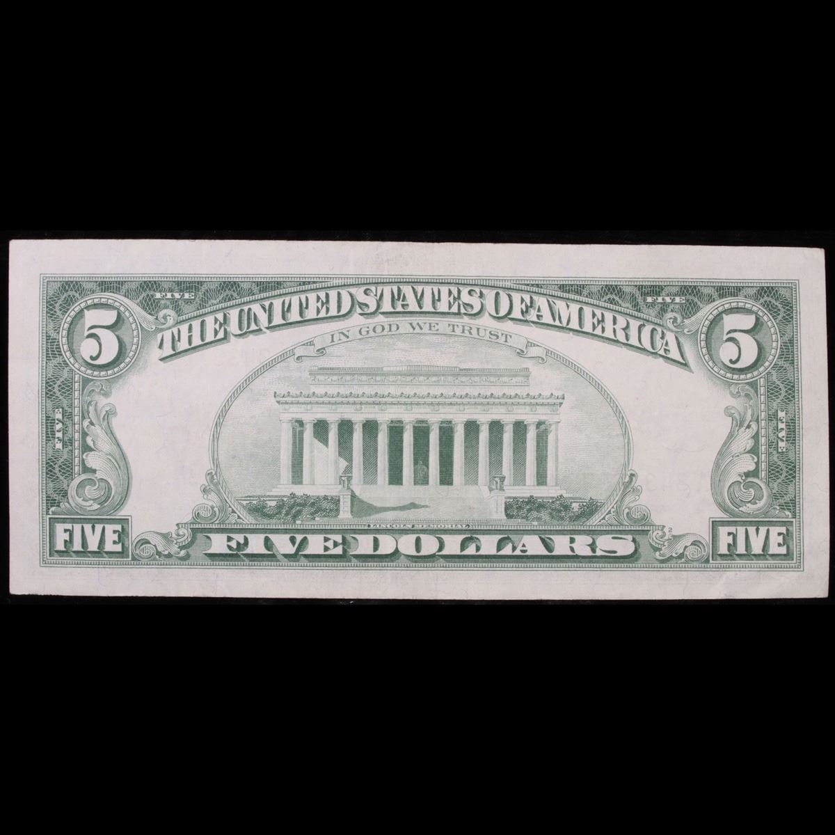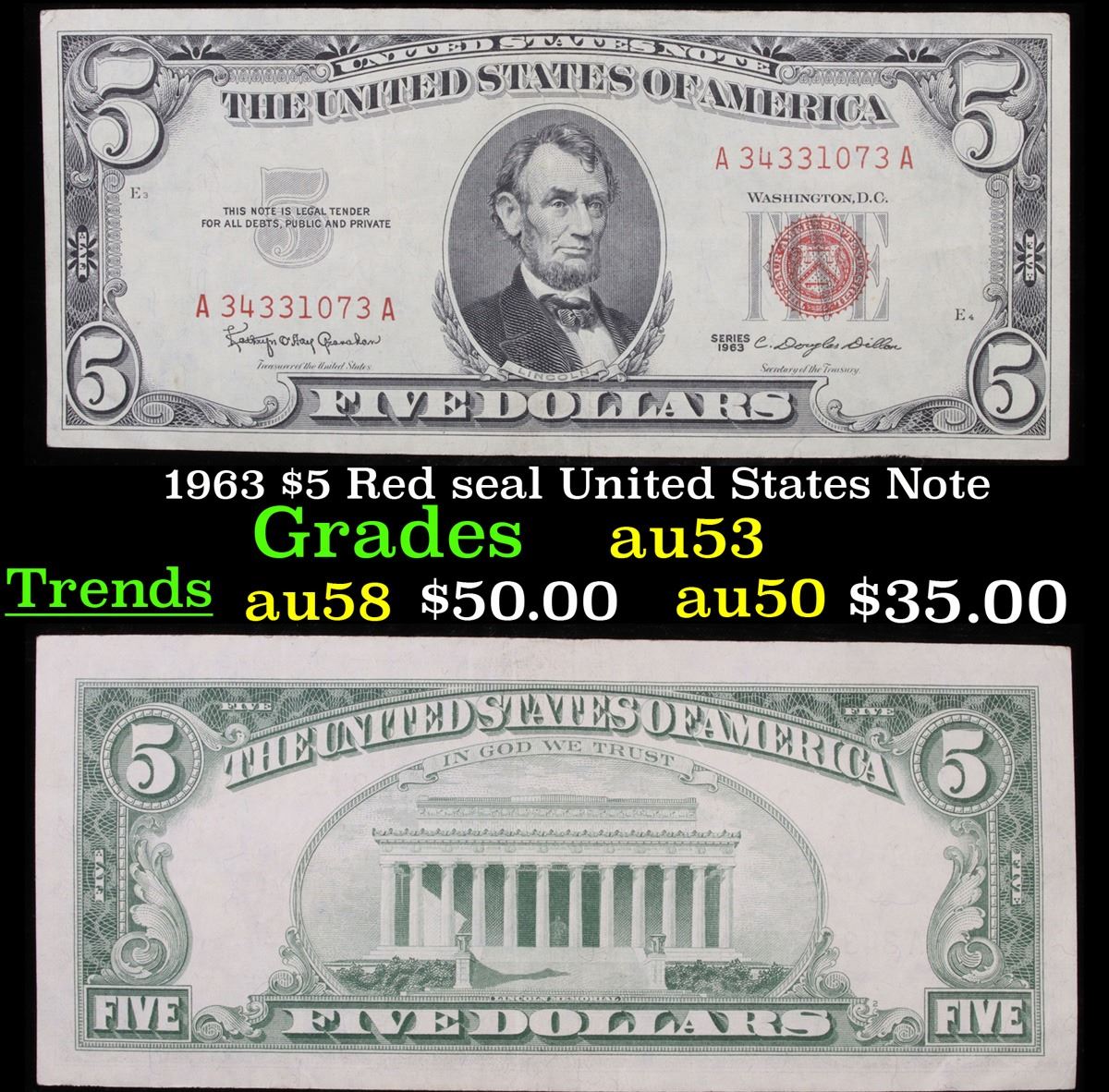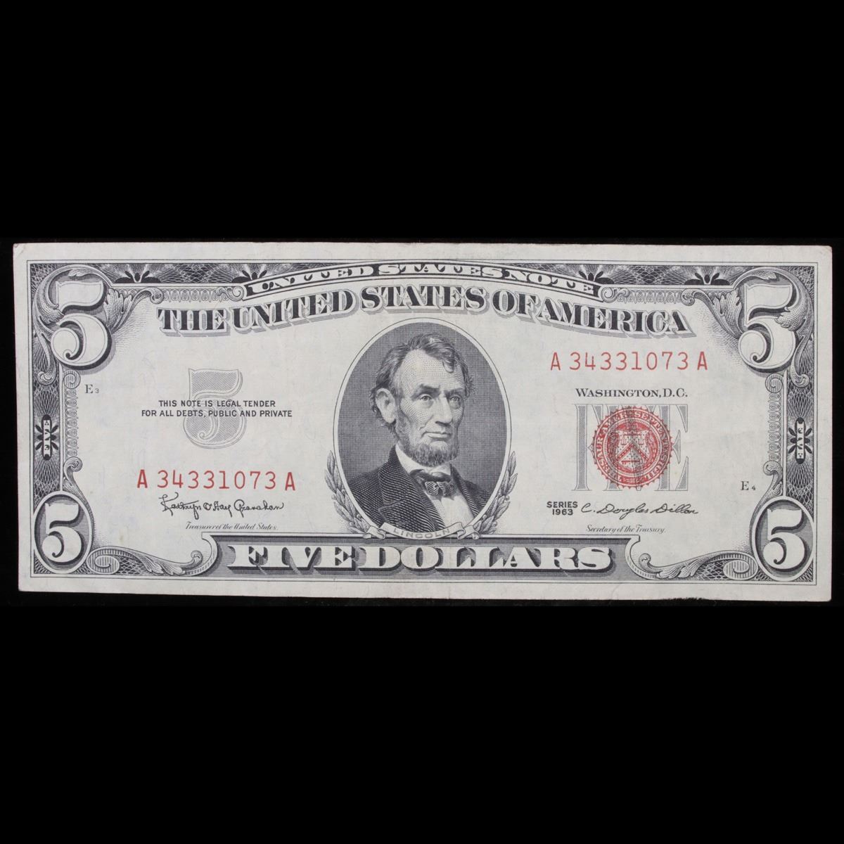 1963 $5 Red seal United States Note Grades. Each 1963 five dollar red seal bill has serial number written in red ink. There is a red seal on the right hand side of the bill. All 1963 red seals were printed in Washington DC and feature a portrait of Abraham Lincoln in the center of the bill. You can also find the following wording on each bill, “United States Note, The United States of America, This Note Is A Legal Tender At Its Face Value For All Debts Public And Private, Will Pay To The Bearer On Demand Five Dollars”