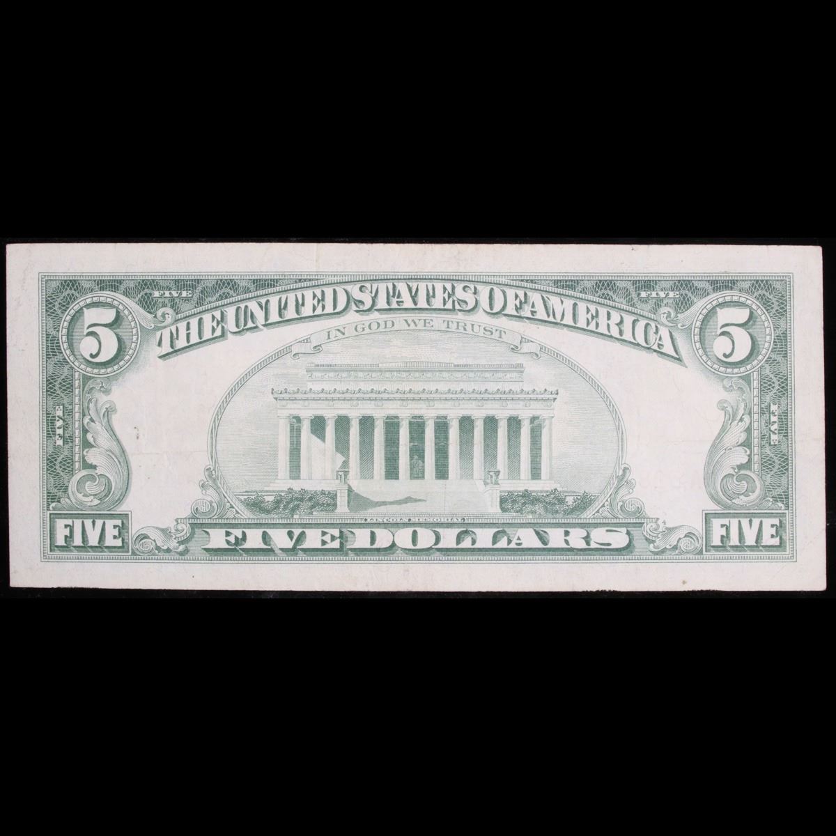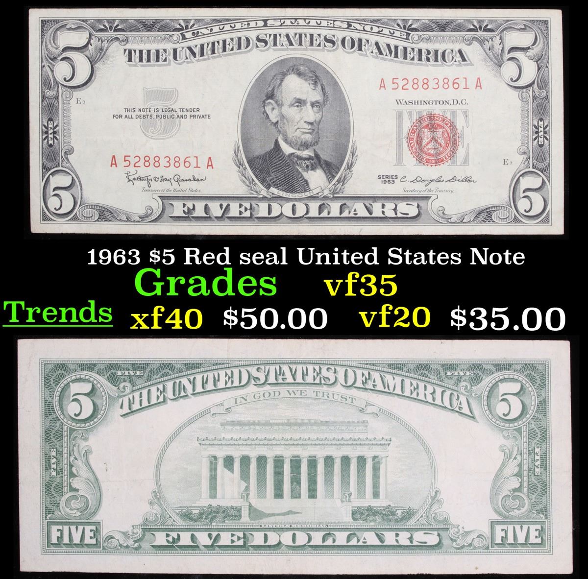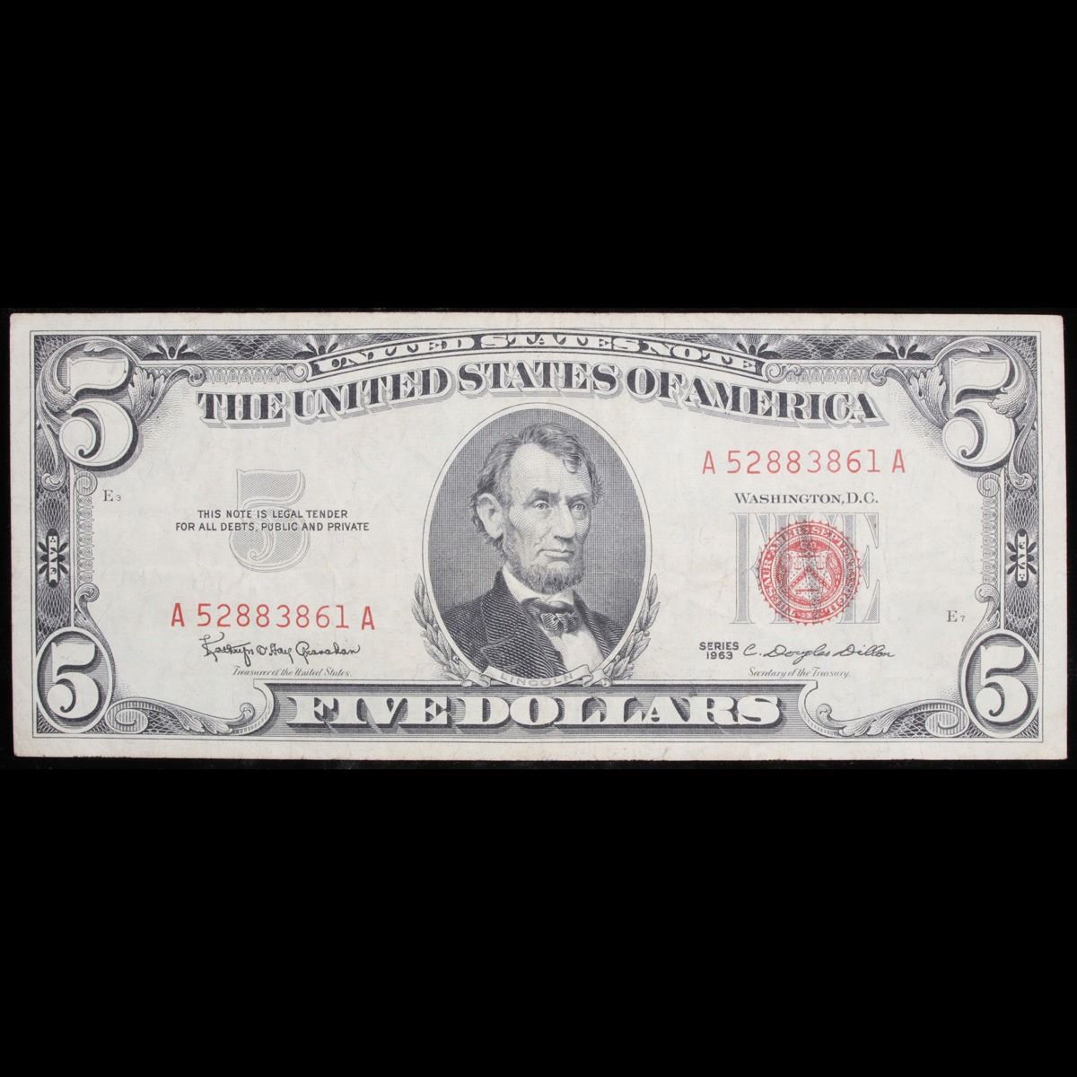 1963 $5 Red seal United States Note Grades. Each 1963 five dollar red seal bill has serial number written in red ink. There is a red seal on the right hand side of the bill. All 1963 red seals were printed in Washington DC and feature a portrait of Abraham Lincoln in the center of the bill. You can also find the following wording on each bill, “United States Note, The United States of America, This Note Is A Legal Tender At Its Face Value For All Debts Public And Private, Will Pay To The Bearer On Demand Five Dollars”