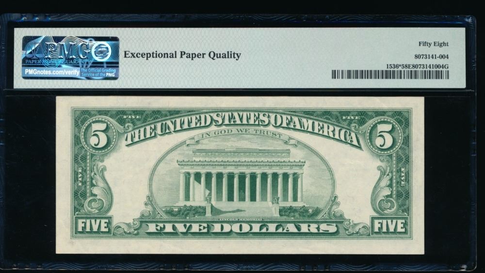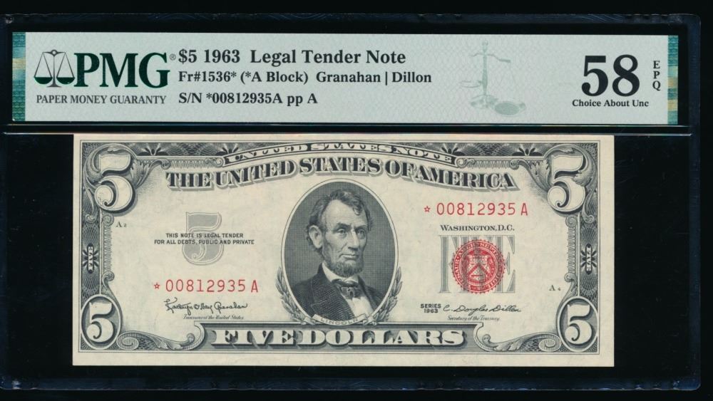 One 1963 $5 STAR Legal Tender Note PMG 58EPQ.