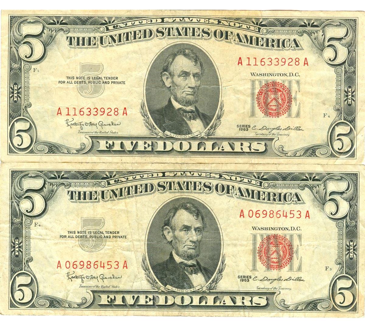 1963 $5 VG/XF Red Seal Note Lot of 2.