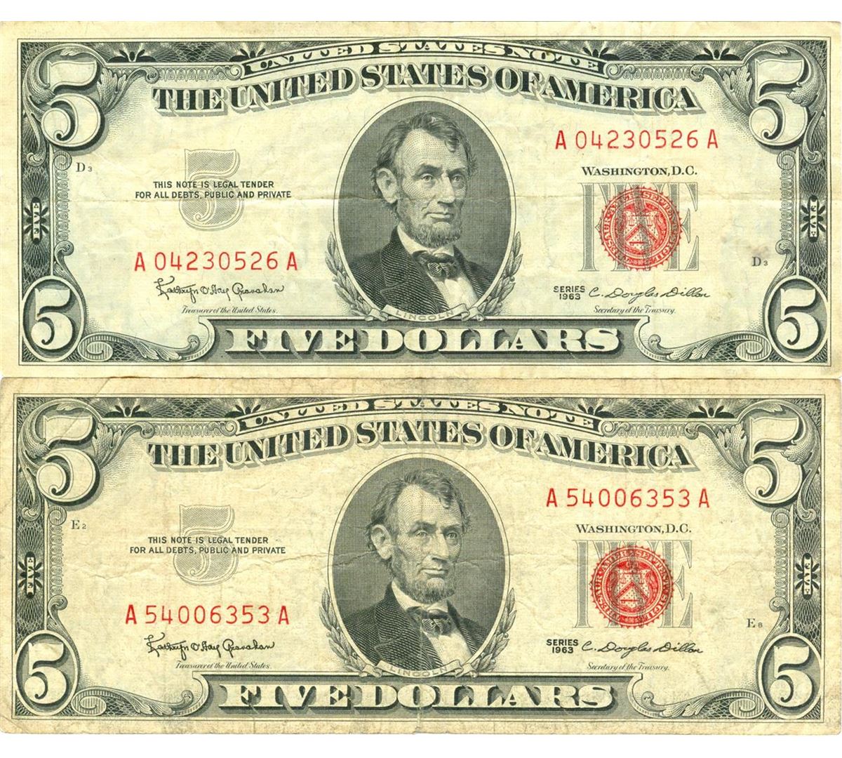 1963 $5 VG/XF Red Seal Note Lot of 2.