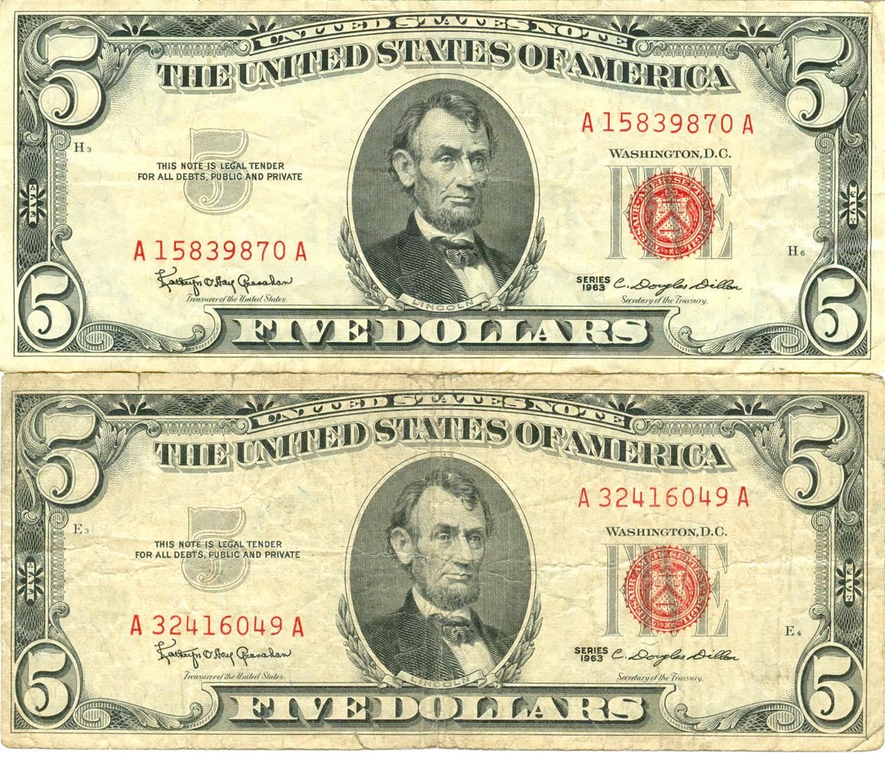 1963 $5 VG/XF Red Seal Note Lot of 2.