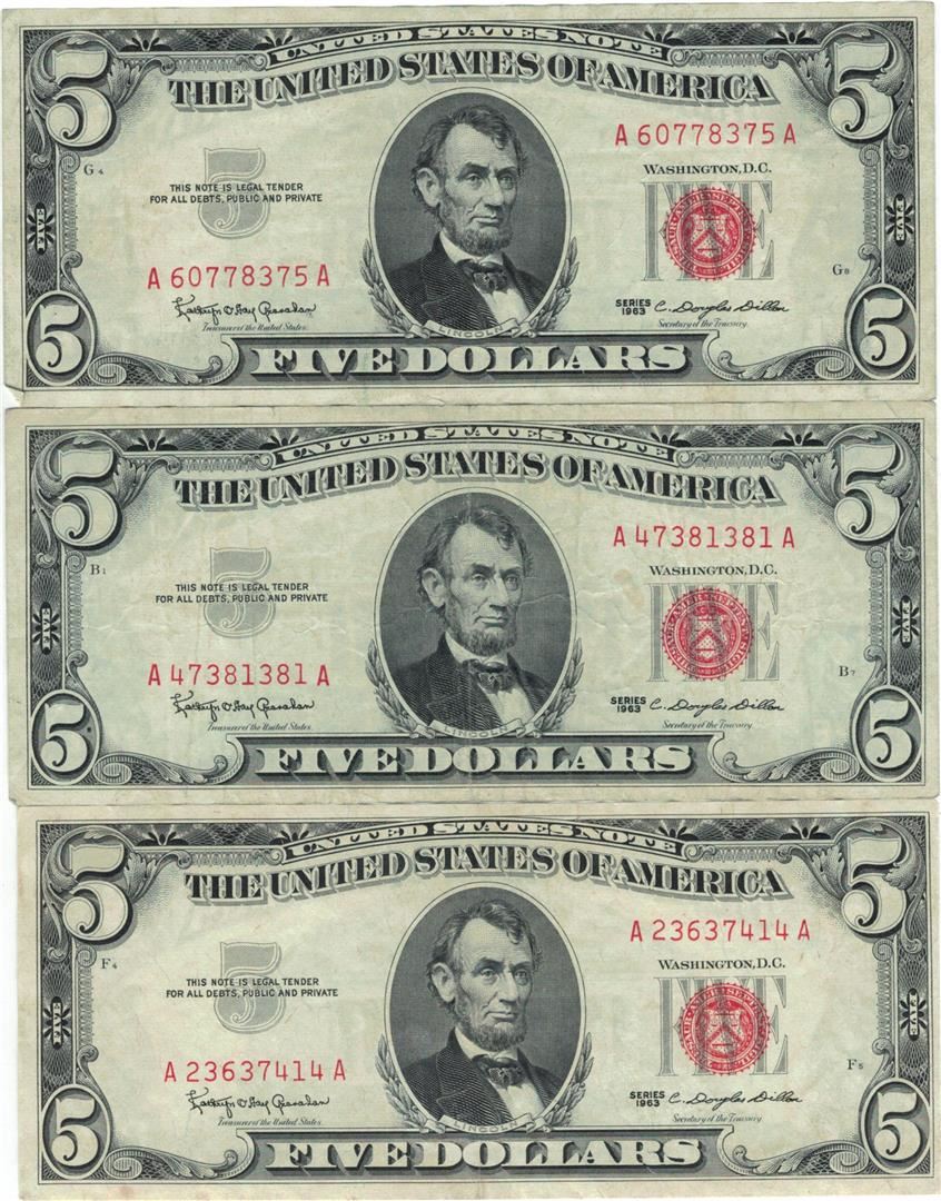 1963 $5 VG/XF Red Seal Note Lot of 3.