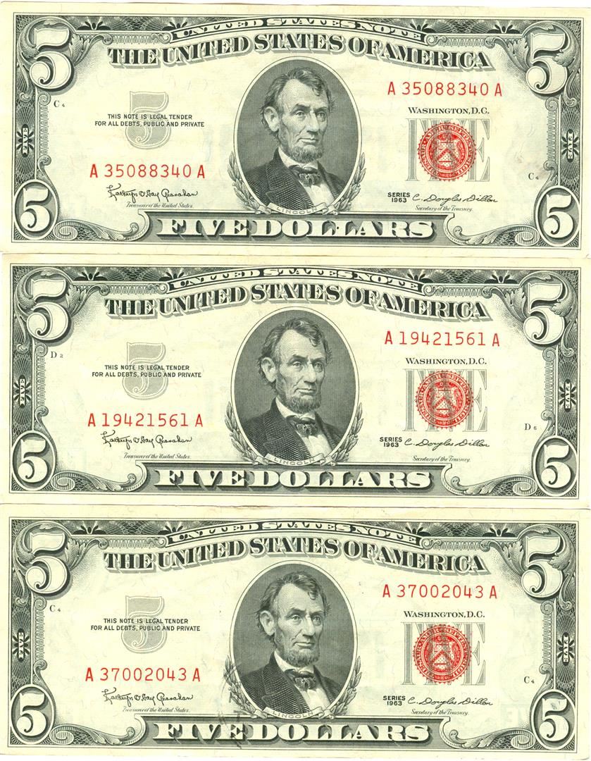 1963 $5 VG/XF Red Seal Note Lot of 3.