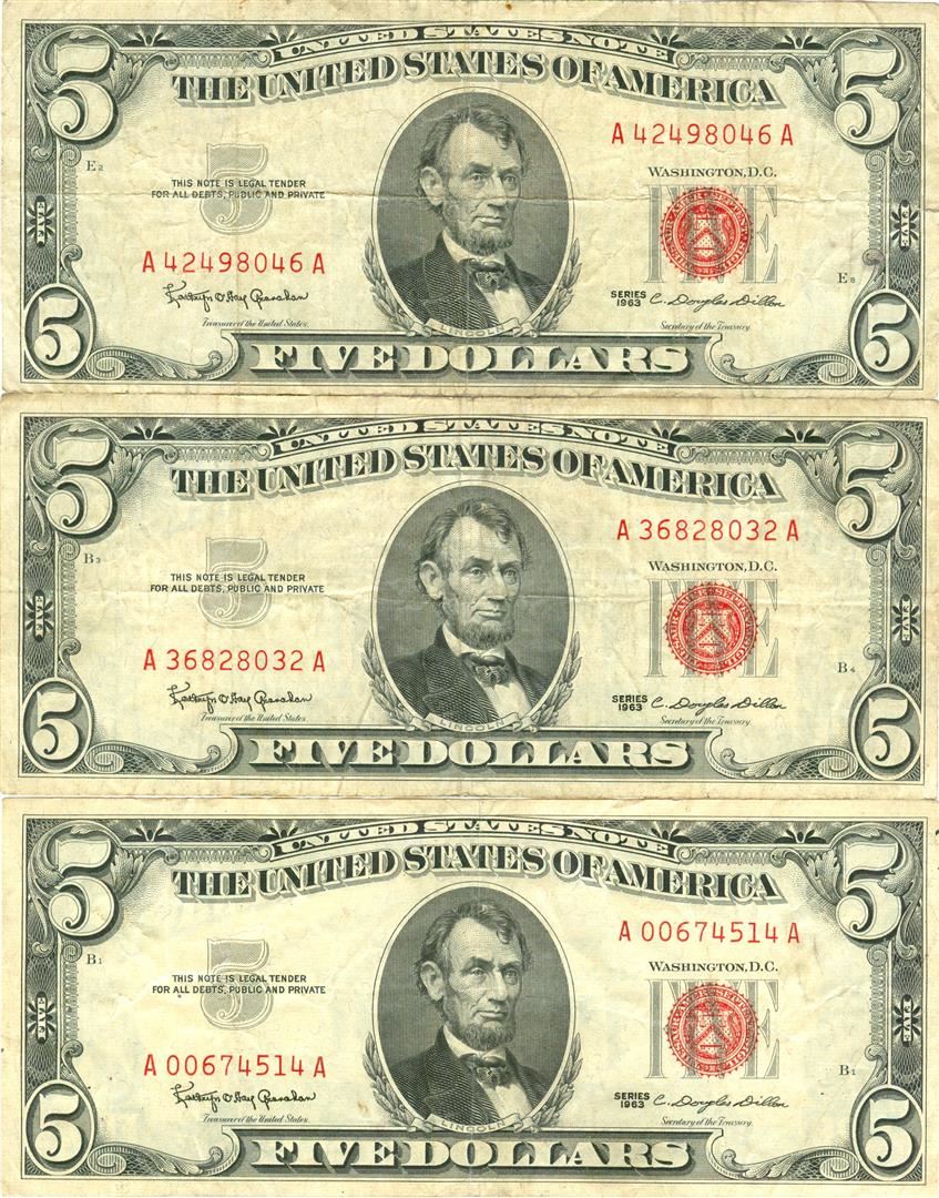 1963 $5 VG/XF Red Seal Note Lot of 3.