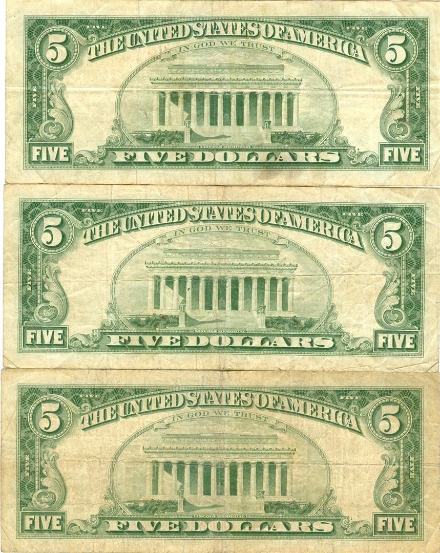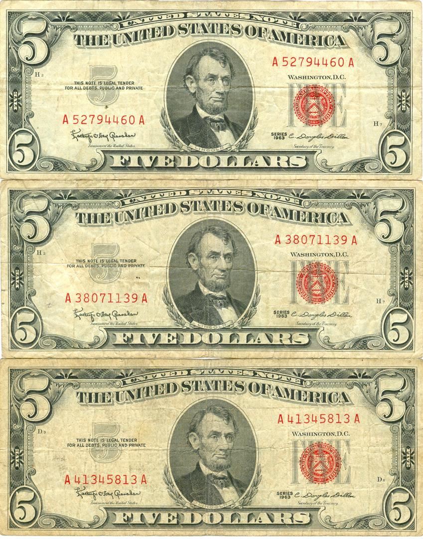 1963 $5 VG/XF Red Seal Note Lot of 3.