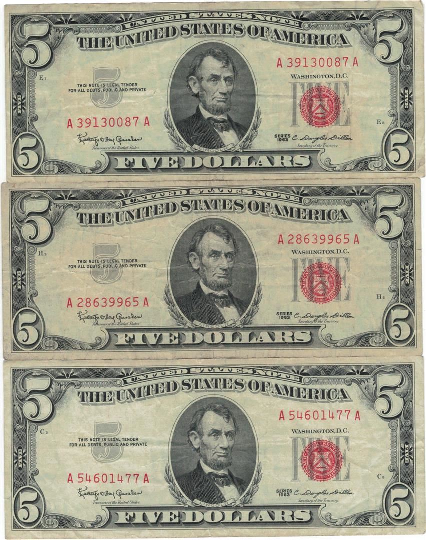 1963 $5 VG/XF Red Seal Note Lot of 3.