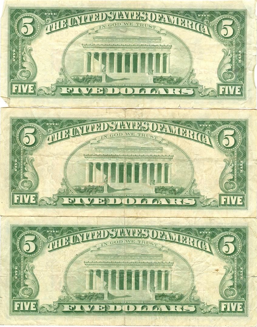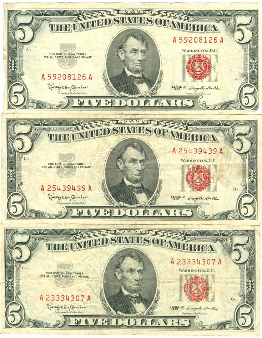 1963 $5 VG/XF Red Seal Note Lot of 3.